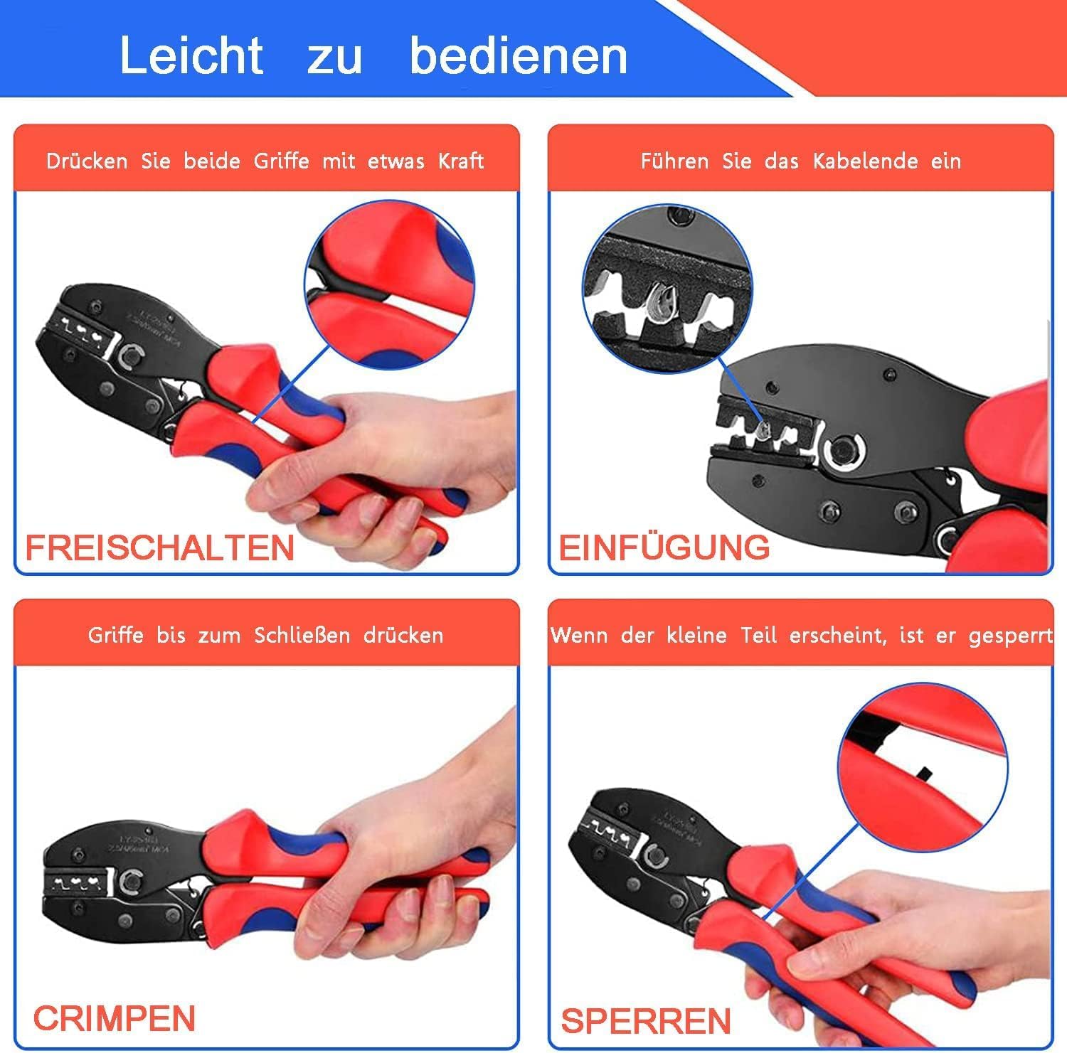 - 【Materialien】 :Die Solar-Crimper besteht aus Kohlenstoffstahl und hochfestem legiertem Stahl für eine lange Lebensdauer. Der Griff besteht aus PP+TPR-Kunststoff, der ein angenehmes Handgefühl bietet und rutschfest ist. Für den Draht und den