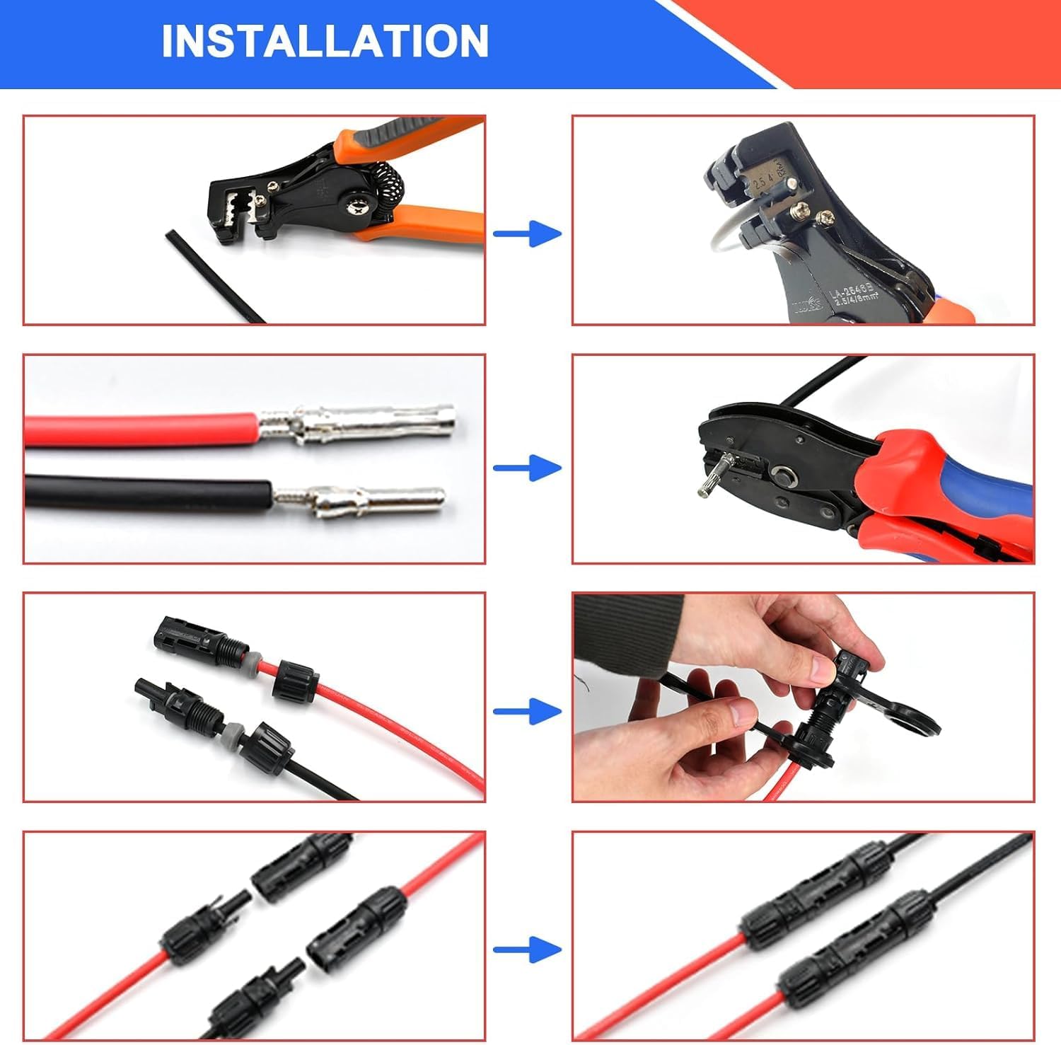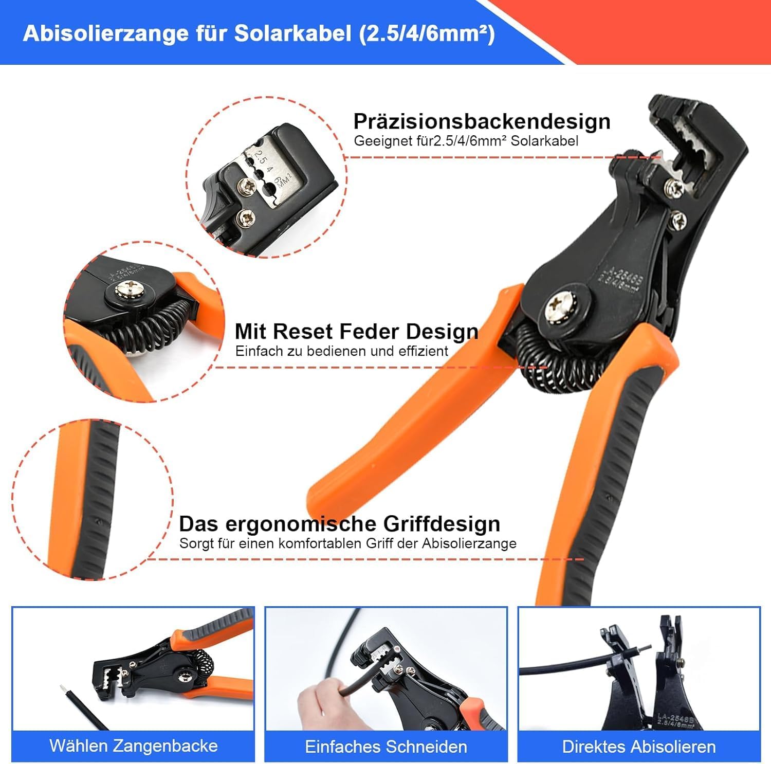 - 【Crimpzange】: Geeignet für 2,5-6,0 mm² Solarpanelkabel. Das leichte und kompakte Design kann den perfekten Crimpeffekt gewährleisten.