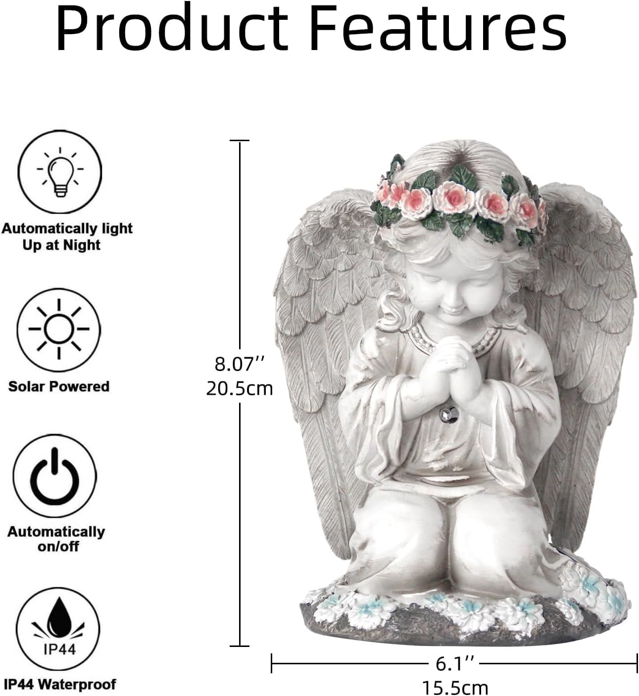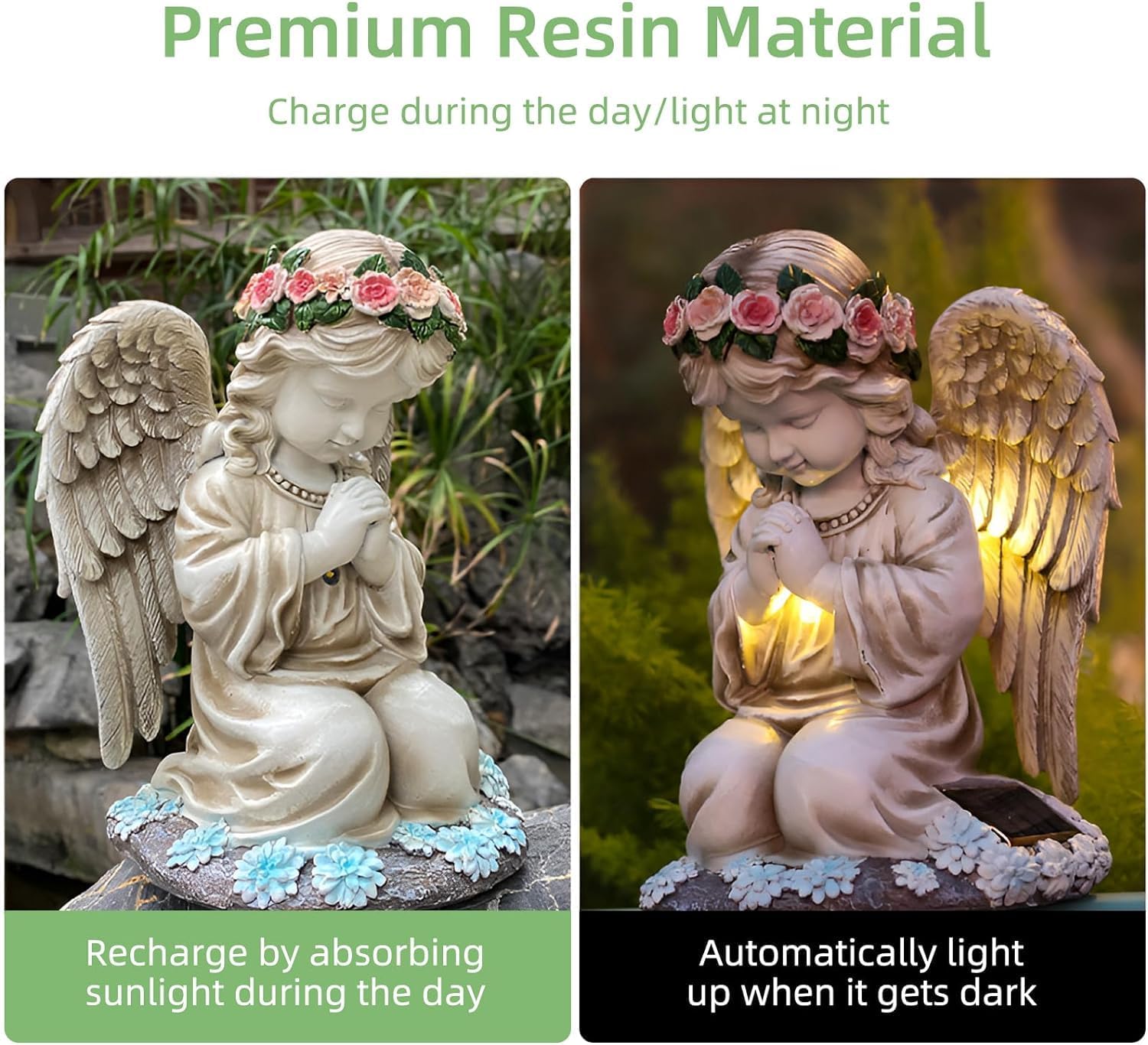 - SOLARLEUCHTEN: Die Solarengel-Gartenfiguren für den Aussenbereich werden durch ein Solarpanel aufgeladen. Die wetterfesten IP44-Solarengel-Gartendekorationen laden die Batterie tagsüber automatisch auf und leuchten in der Abenddämmerung. Es kann