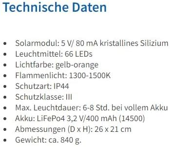 - Lichtfarbe: gelb-oranges Flammenlicht - Leuchtmittel: 24 LEDs - Solarmodul: 4,5 V/ 150 mA kristallines Silizium - Leuchtdauer: 6-8 Std. bei vollem Akku