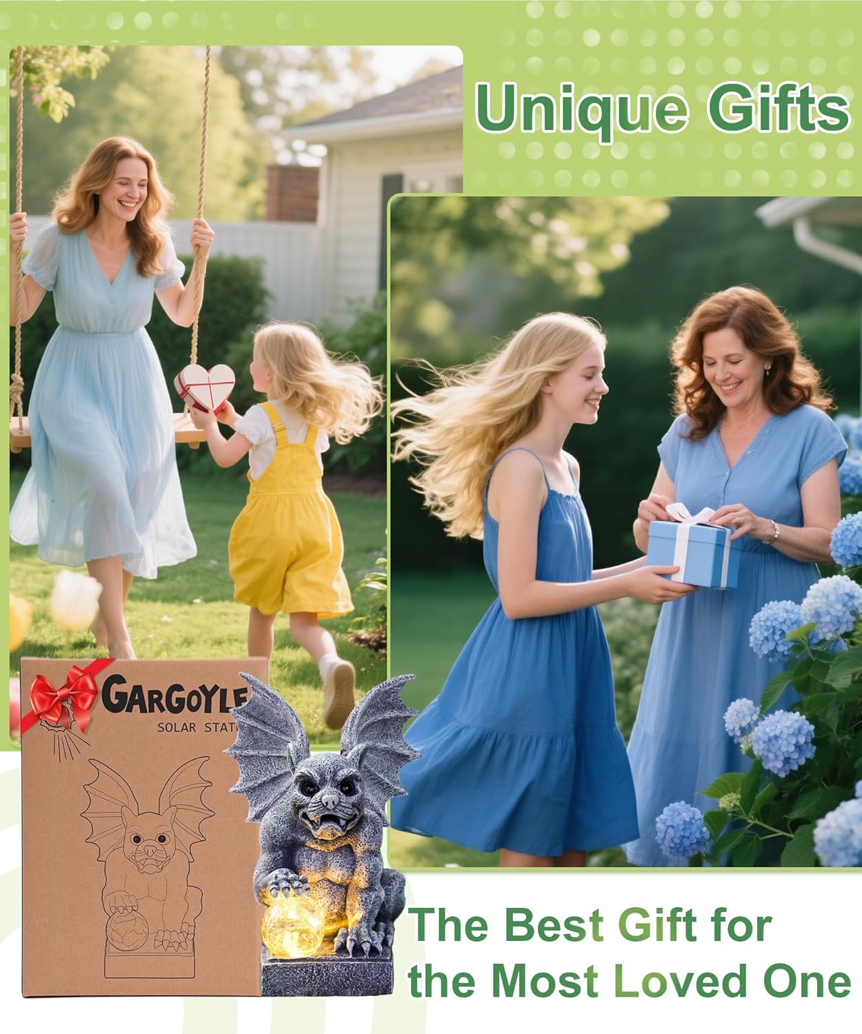 - 🎨 Einzigartiges Design mit Glasball-Detail: Gargoyle-Figur in edlem Steingrau, kunstvoll auf Sockel platziert. Das Highlight: Zerbrochen wirkender Glasball unter der Kralle mit sanftem Solar-LED-Lichteffekt!