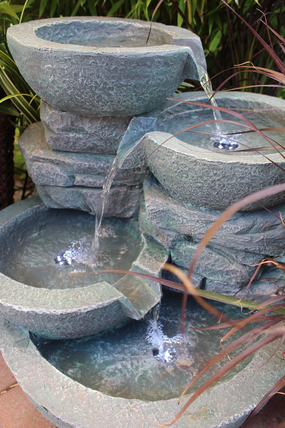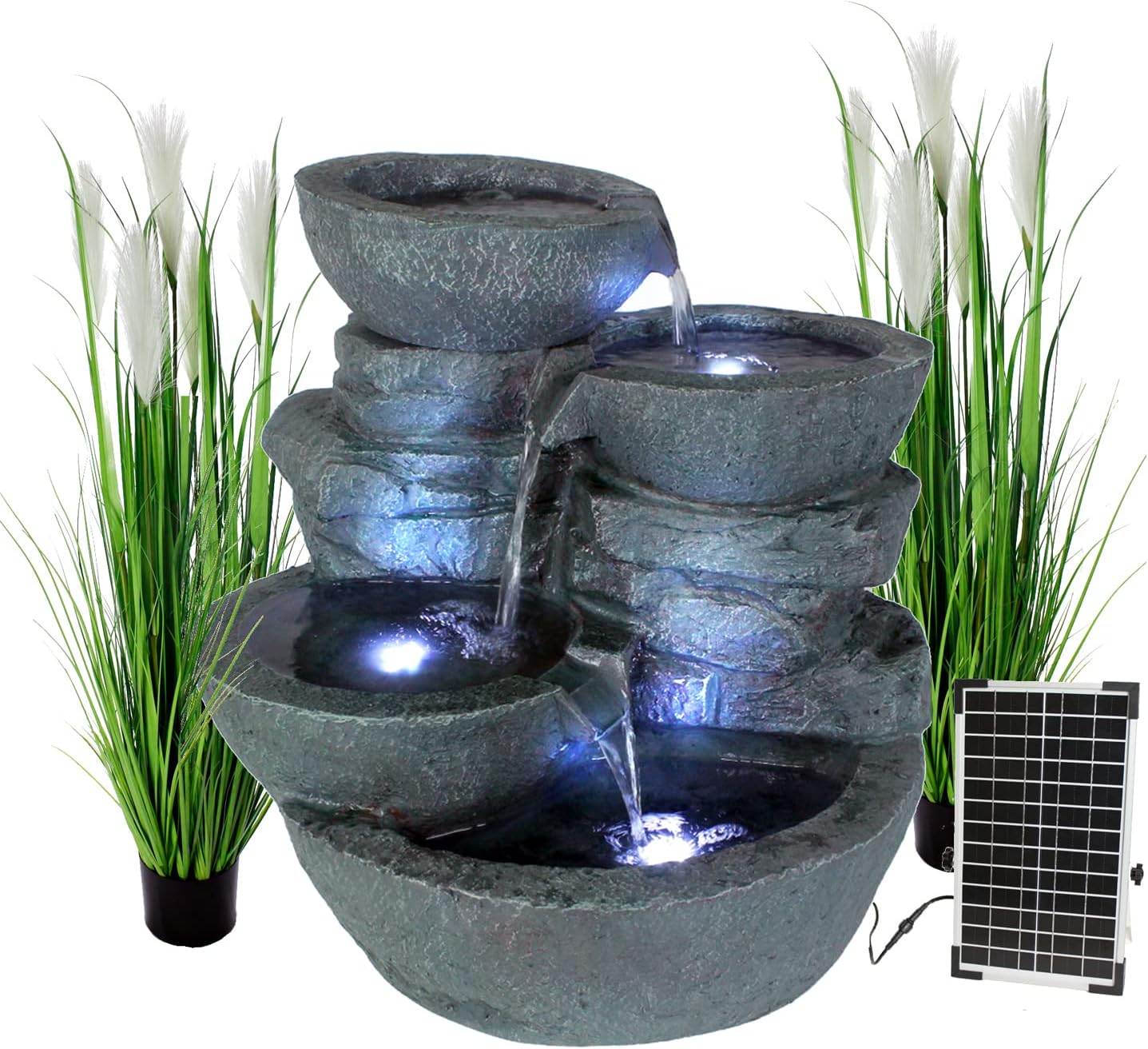 - Solar Gartenbrunnen Cascades mit Beleuchtung. Dieser schöne Springbrunnen ist aus wetterfestem Polyresin (Kunstharz und Steinmehl) hergestellt.