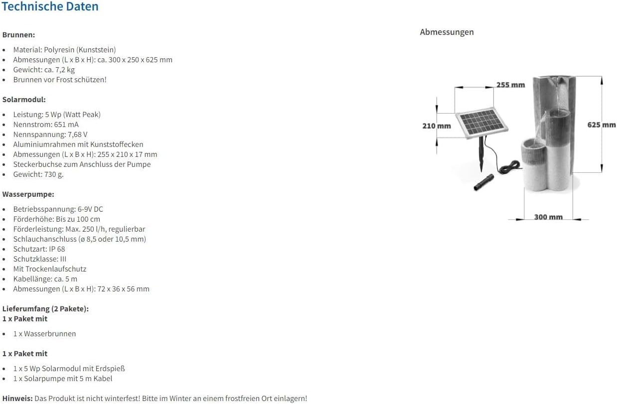 - Hochwertig verarbeiteter Gartenbrunnen in Steinnachbildung aus Polyresin (Kunststein) - Abmessungen (L x B x H): ca. 300 x 250 x 625 mm - Gewicht: ca. 7,2 kg