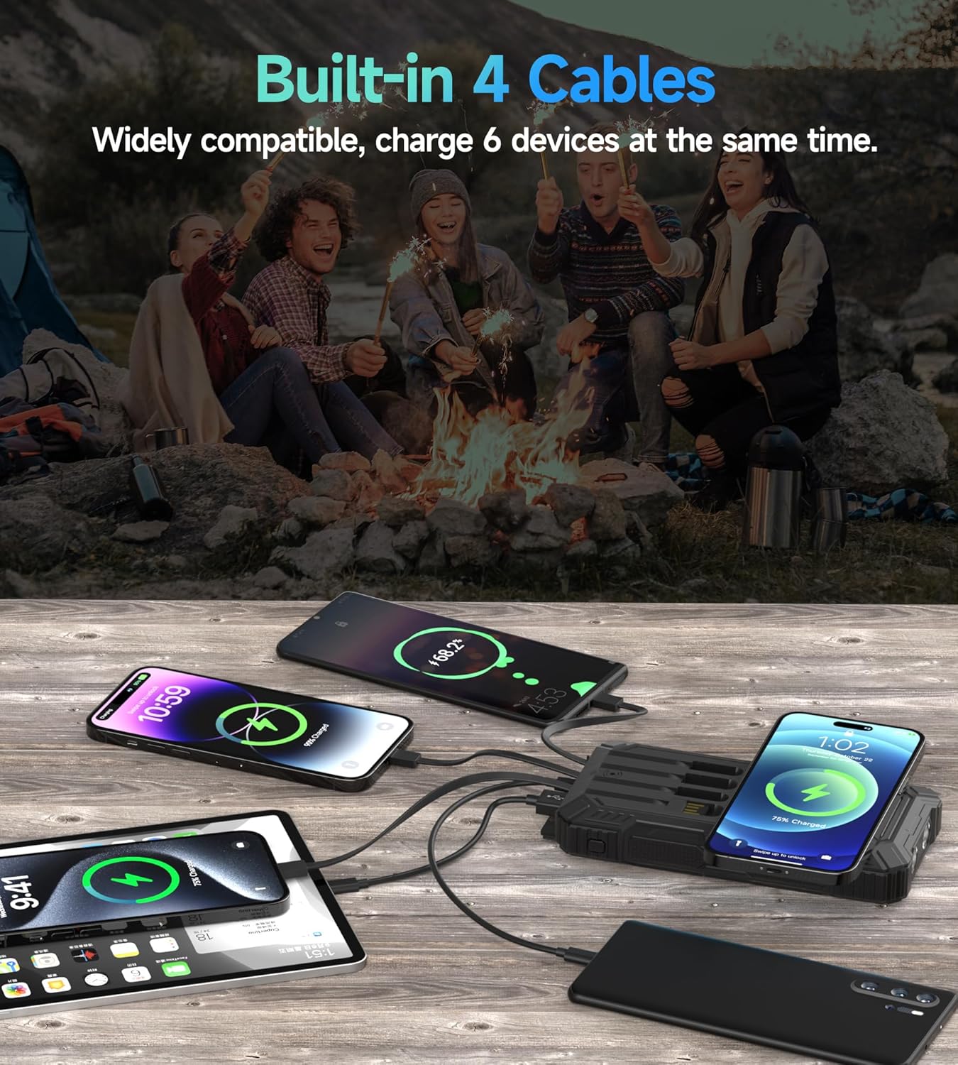 - 【6 Ausgänge】 6 Ausgänge und 3 Eingänge, einschliesslich integriertem Typ-C, Micro-USB, Standard-Ausgang Datenkabel und 15W drahtloses Laden, eliminiert die Notwendigkeit, sperrige Kabel zu tragen. Hinweis: hauptsächlich auf das Aufladen der