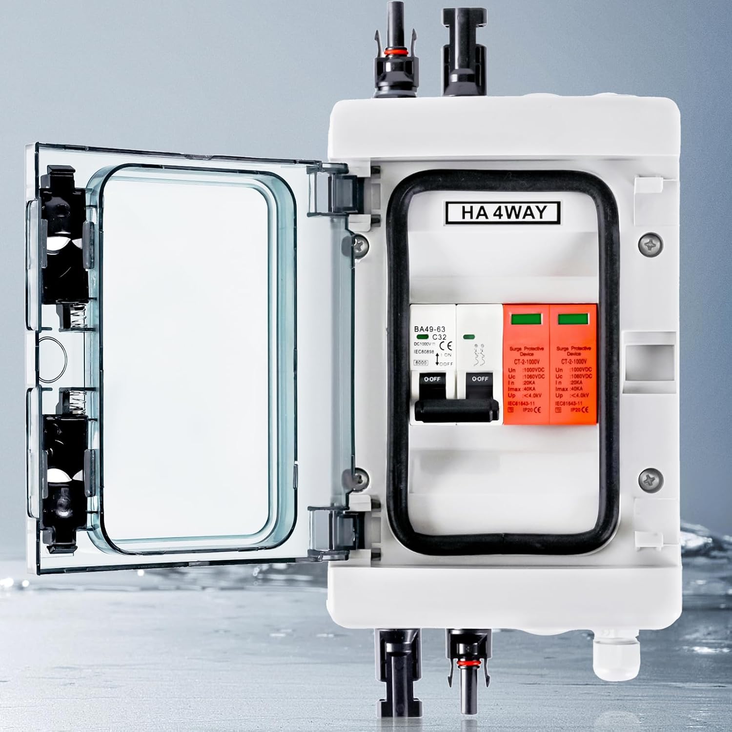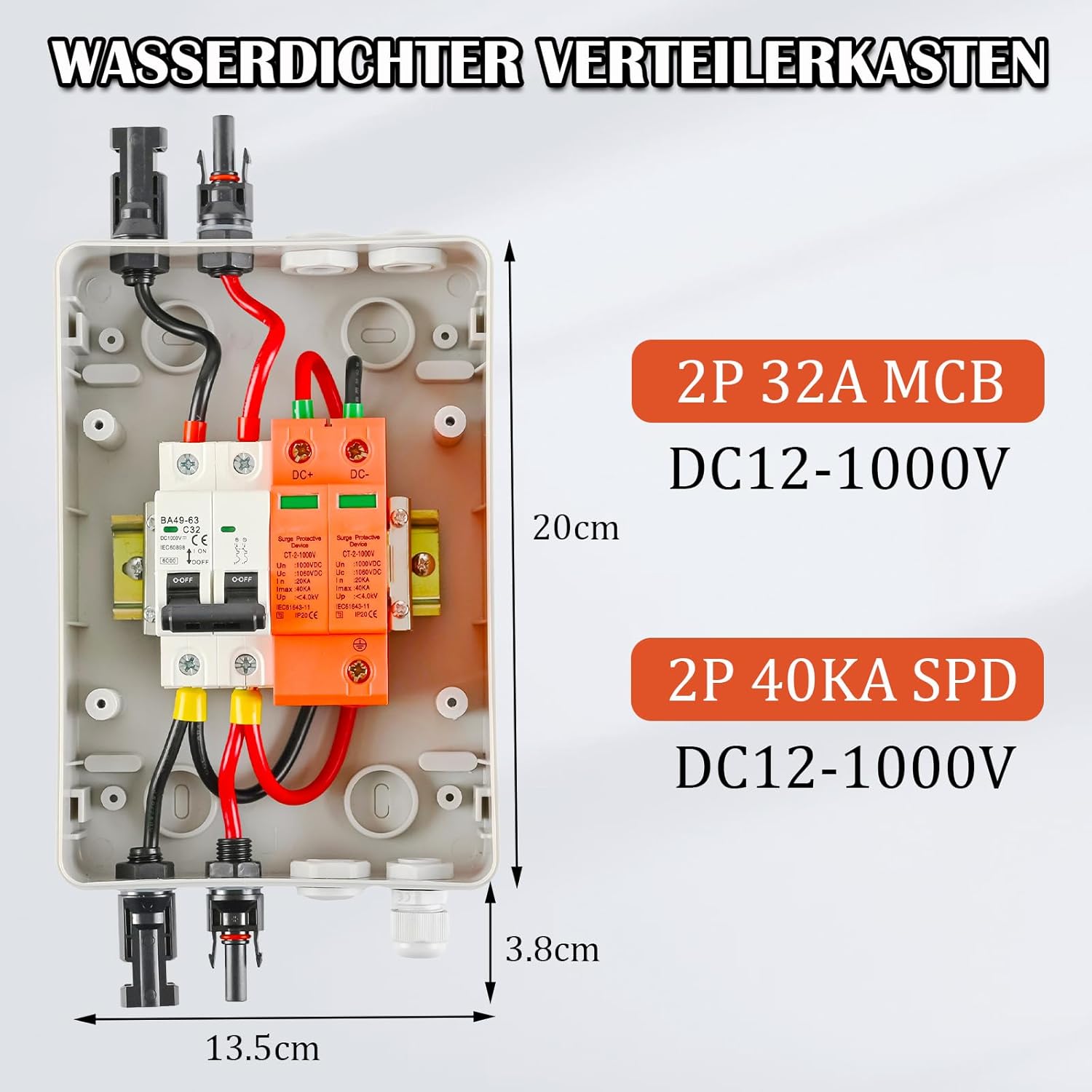 - Ausstattung:1x Aufputzgehäuse IP65 4-Module,1x Blitzschutz 2P T2 1000V DC 32A,1x PV-Sicherungshalter 2-polig,2x DC-Sicherungstrennschalter 15A 10x38 1000V DC,2x Kabelverschraubung PG 13,5/16,2x Stecker für MC4-PM,2x Gummistopfen,1x Montageset: