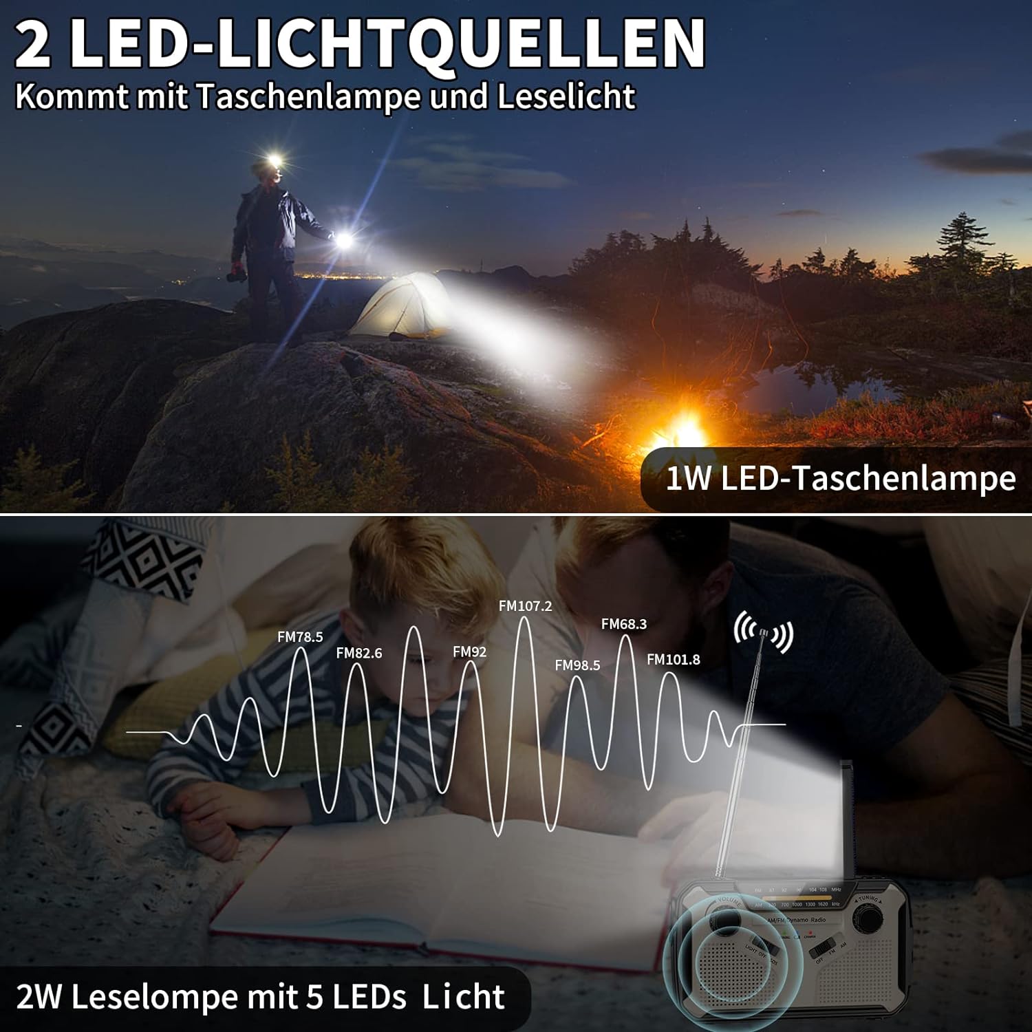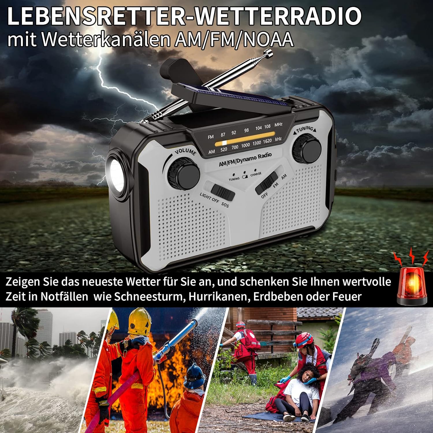 • Merkmale: 4 Energiequellen: USB-Aufladung, Handkurbel, Solarenergie, AAA-Batterien (nicht im Lieferumfang enthalten) Wetterwarnung: Abrufen der neuesten Wetter- und Gefahreninformationen, um Sie daran zu erinnern, sich im Voraus vorzubereiten 4000mAh Power Bank: Versorgt jedes mobile Gerät im Notfall mit Strom SOS-Alarm: Machen Sie sich auffindbar oder bitten Sie im Notfall um Hilfe 3W LED-Taschenlampe: orgen Sie für Helligkeit im dunklen Bereich 3,5-mm-Kopfhörerbuchse: Lassen Sie die Sendung im Rauschen hören oder geniessen Sie Ihre Zeit
