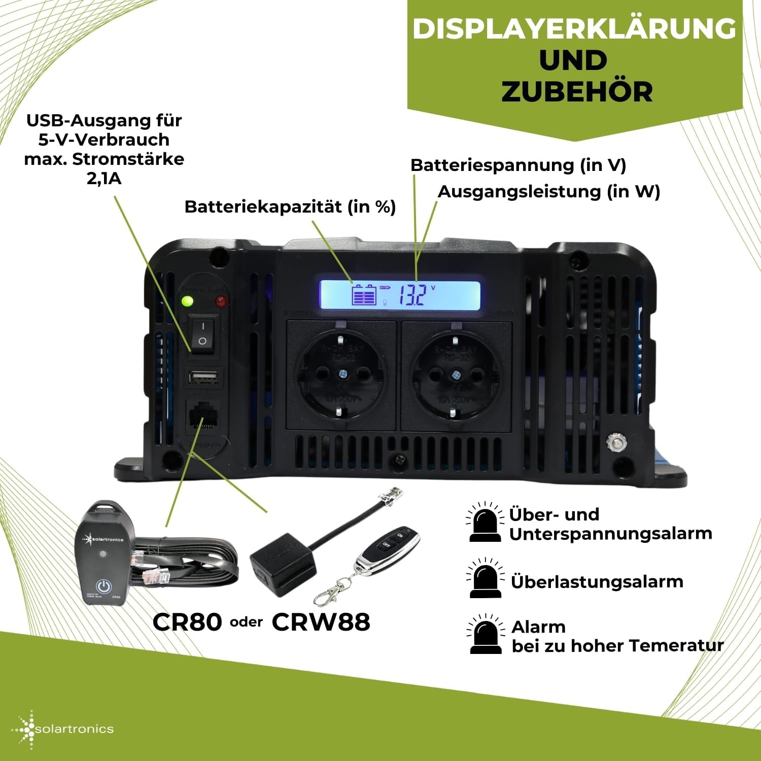 - LiFePO4 / Lithium, Blei-, Gel oder AGM-Batterie kompatibel.