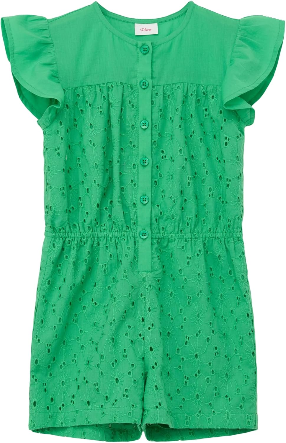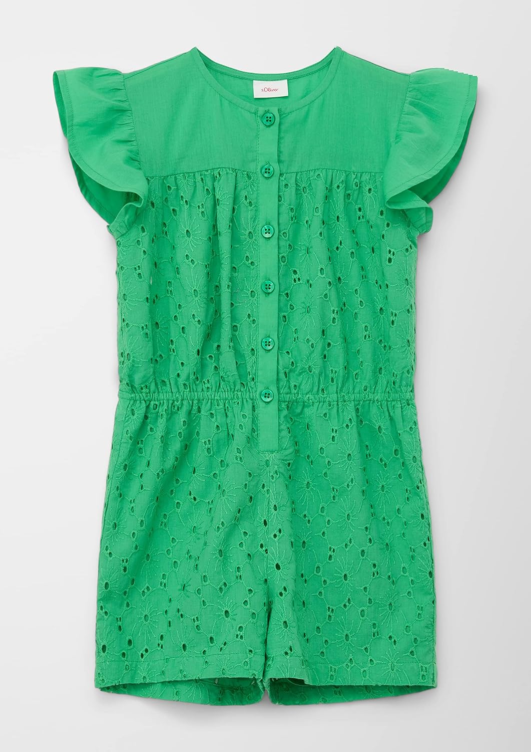 PRODUKTBESCHREIBUNGEN Dieser kurze Overall im eleganten Stil bezaubert durch Broderie Anglaise und Modal in feiner und hochwertiger Qualität. Er ist enorm lässig für den Bereich der Casual-Fashion. Der Overall hat kurze Volantärmel. Der Rundhalsausschnitt rundet die Optik ab. Eine Knopfleiste dient als Verschluss dieses Overalls. Dank des Elastikbunds passt der Jumpsuit perfekt. Der Overall hat einen Regular Fit. Die Rückenlänge liegt bei 28 cm bei Grösse M. Mehr