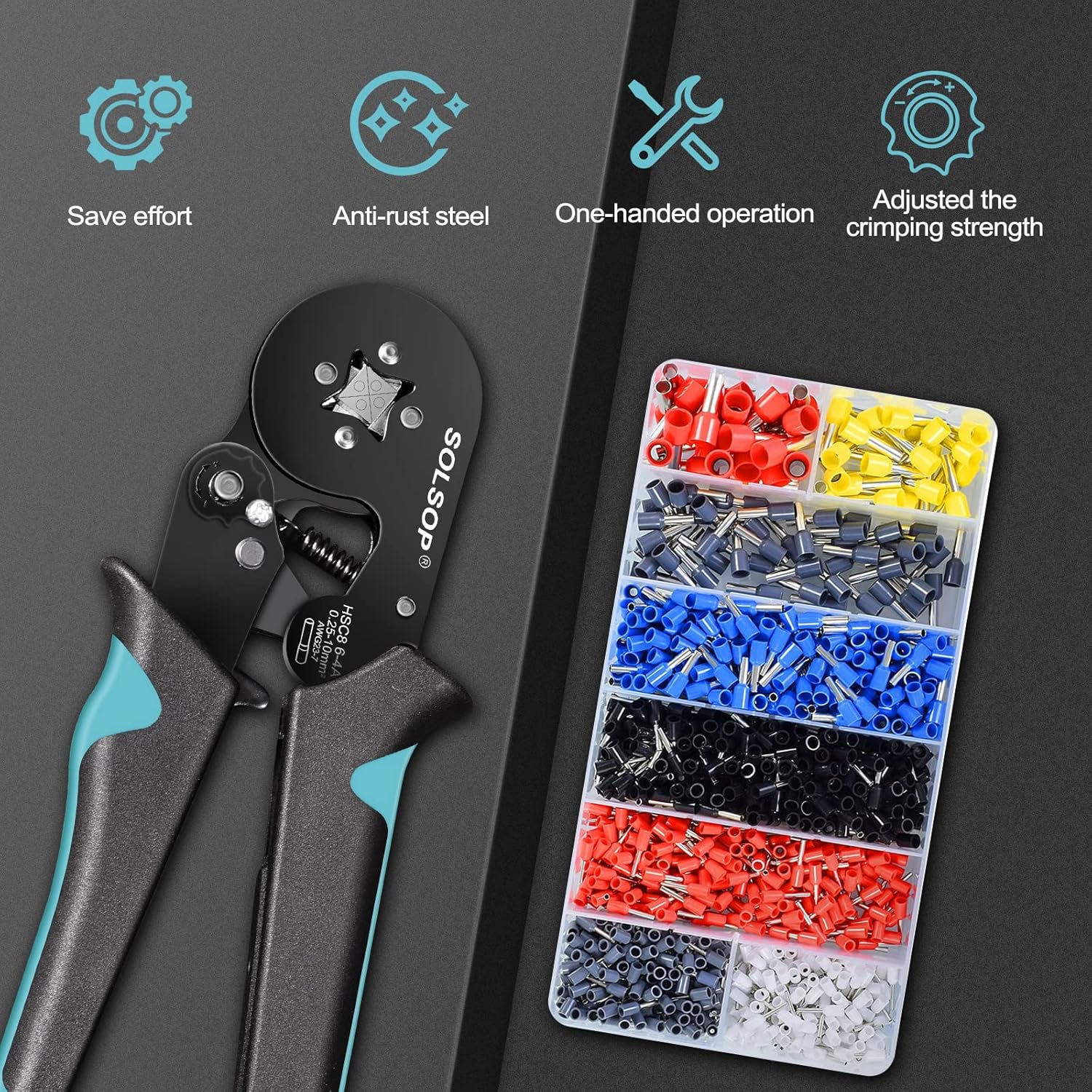 - Aderendhülsen-Set – kommt mit einer Aderendhülsen-Crimpzange, selbsteinstellenden Abisolierzangen 20,3 cm und 1250 isolierten Kabelklemmen zur Unterstützung kleiner DIY-Projekte und grosser elektrischer Reparaturen