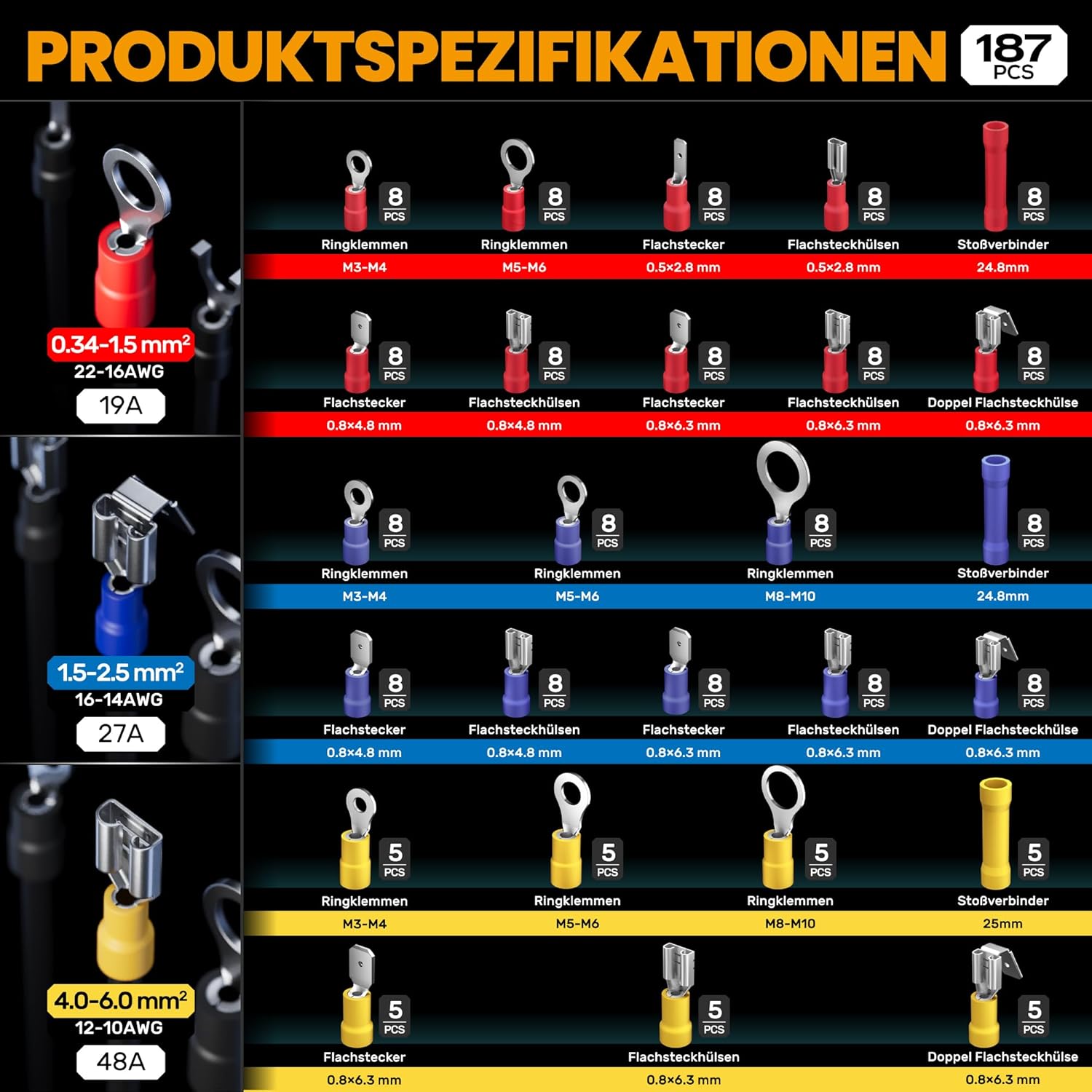 • 🧰【26 ARTEN KABELSCHUHEN】187 Stück Isolierte Quetschkabelschuhe, verwendbar für Kabel von 0,34–6 mm². Kabelschuhe bestehen aus verzinntem Kupfer mit PVC-Isoliermantel. Dazu gehören: Ringkabelschuhe, 2,8/4,8/6,3mm Flachsteckhülsen,