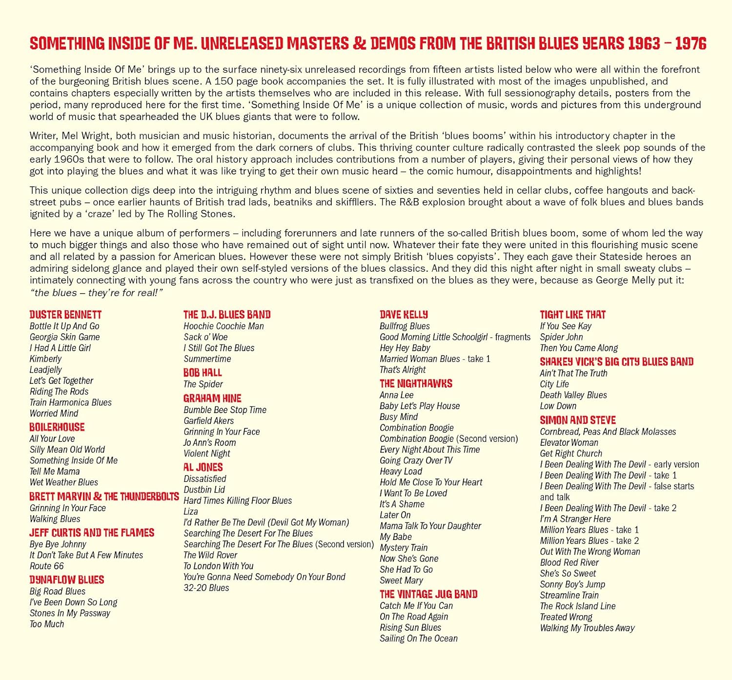 PRODUKTBESCHREIBUNGEN Something Inside Of Me' brings to the surface ninety-six unreleased recordings from fifteen artists who were all at the forefront of the burgeoning British blues scene of the early 1960s to mid 1970s. There is a varied range of performers with diverse styles that represented the spirit and soul of this music. Soloists, duos, trios, jug band acts and fully-fledged blues and rhythm and blues bands.A 150-page book accompanies the set. It is fully illustrated with most of the images having never before been published, and contains chapters especially written by the artists themselves who are included in this release. Full sessionography details and posters from the period are included, many reproduced here for the first time. 'Something Inside Of Me' is a unique collection of music, words and pictures from this underground world of music that spearheaded the giant UK blues scene that was to follow.The title of this anthology, taken from one of Danny Kirwan's The Boilerhouse tracks, perhaps quite appropriately sums up a feeling that British blues performers had about the blues. At the time these players eagerly adopted, even for their own compositions, self-styled versions of Black American imagery and lyrics. So, Mojos working, Hellhounds, Hoochie Coochie Men, Gypsy Women and Mannish Boys were creatively reinterpreted.When the US blues legends toured these shores to perform, sometimes accompanied by British players, it added to a wider understanding and appreciation of the hard lives of their mentors. As older players, some were of similar age to their parents, although considerably more hip! As Texas blues player Curtis Jones called out to the Dynaflow Blues Band just before they accompanied him at Bath University, "Let's jive!"