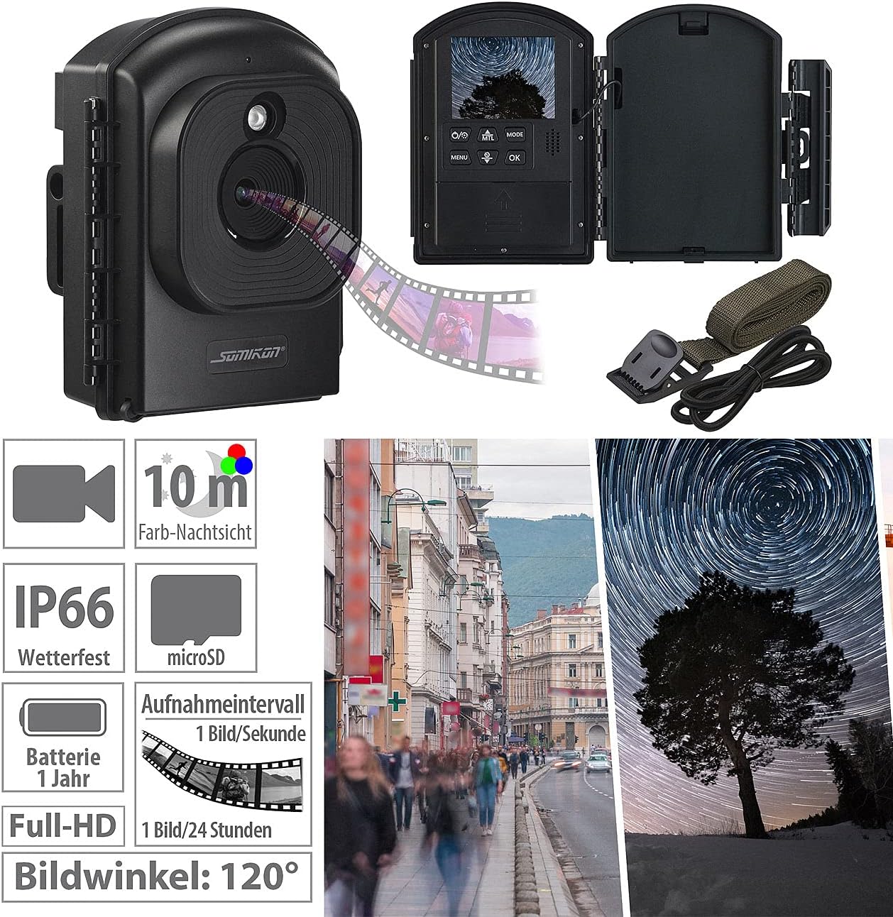 - Erstellt automatisch Zeitraffer-Videos aus kleinen Videos oder Einzelbildern, ohne aufwendige Nachbearbeitung • Weitwinkel-Objektiv: 120° • Wetterfestes Gehäuse: IP66 • Lange Laufzeit mit 12 Batterien: bis zu 1 Jahr bei 144 Bilder/Tag (1 Bild