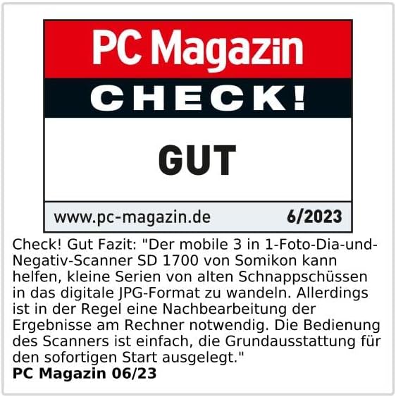 • Autarker 3in1-Scanner SD-1700 für Fotos, Dias und Negative • Optimal positionierte Fotos: je 1 Halter für Dias (mit und ohne Rahmen, 5 x 5 cm), Negativfilm (Typ 135) sowie lose Fotos mit 9 x 13 cm und 10 x 15 cm • Hohe Scan-Geschwindigkeit: ca. 15