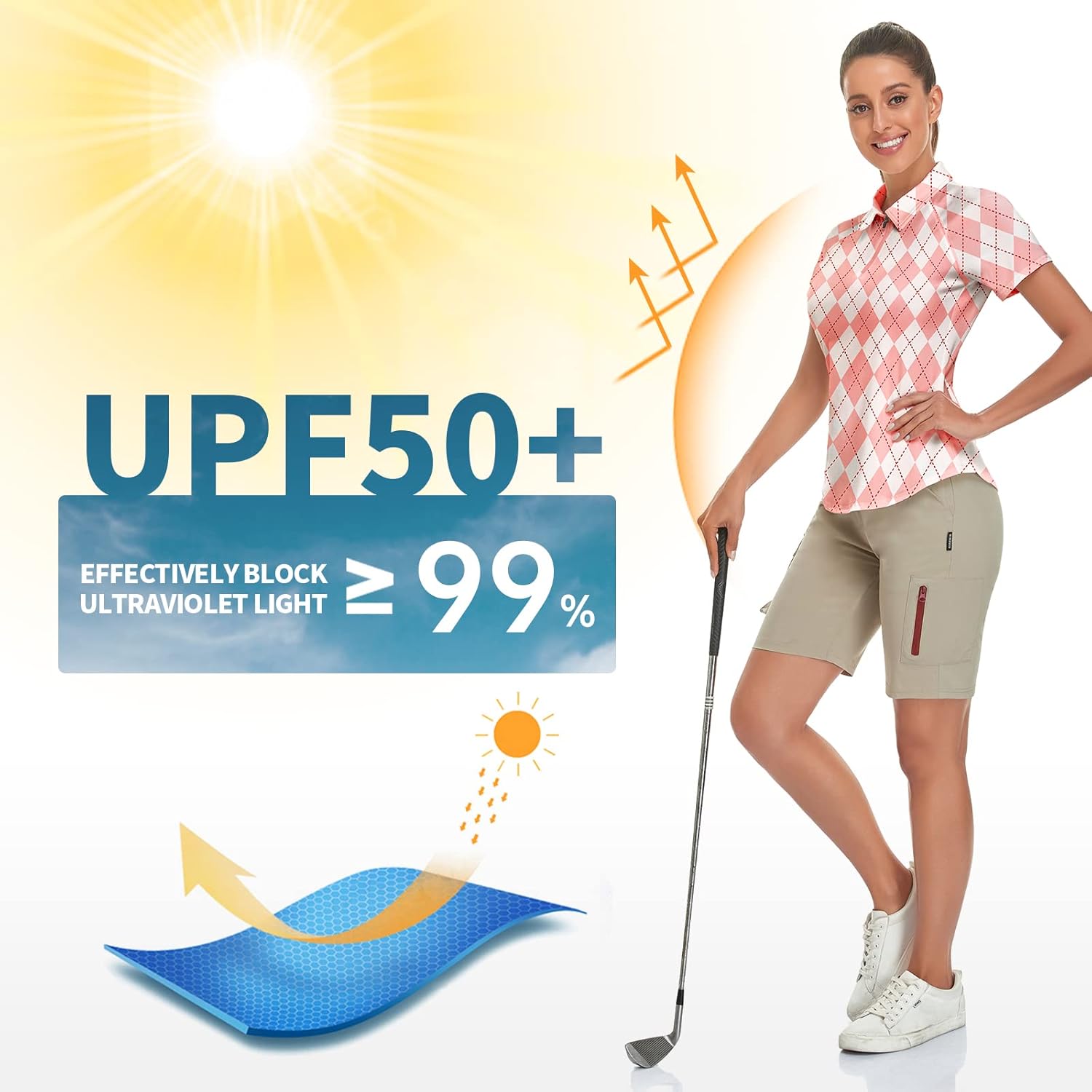 - Poloshirt Damen Kurzarm aus elastischem Material, schlank und leicht, beschleunigt effektiv den Feuchtigkeitstransport von der Haut, um den ganzen Tag kühl und trocken zu bleiben. UPF 50+ vermeidet die direkte Sonneneinstrahlung der Haut.