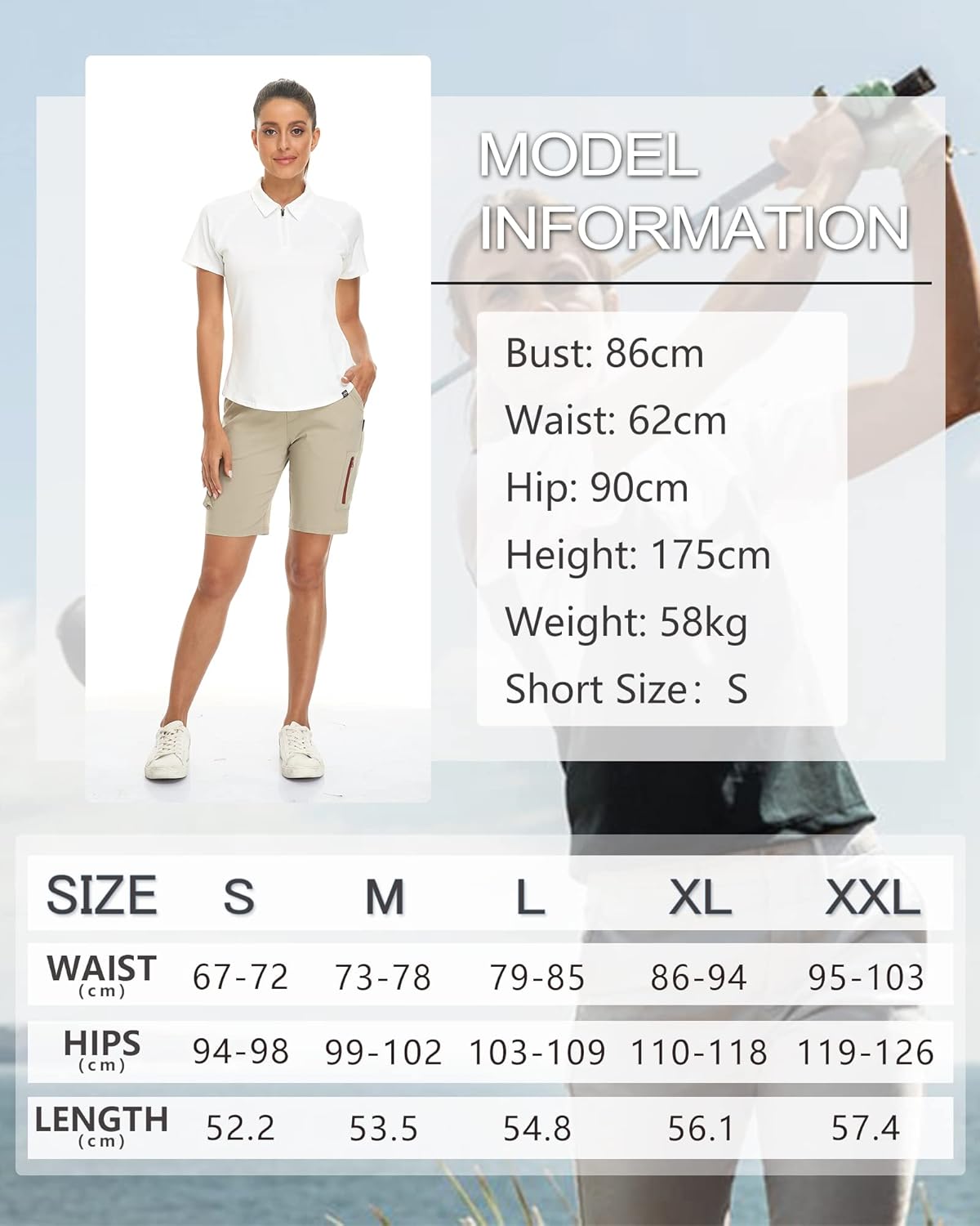 - Bermuda Golf Damen Shorts - Leichtes, strapazierfähiges und superbequemes Stretchgewebe, das Material leitet Schweiss und trocknet schnell, der 4-Way-Stretchstoff sorgt für grössere Bewegungsfreiheit in alle Richtungen.