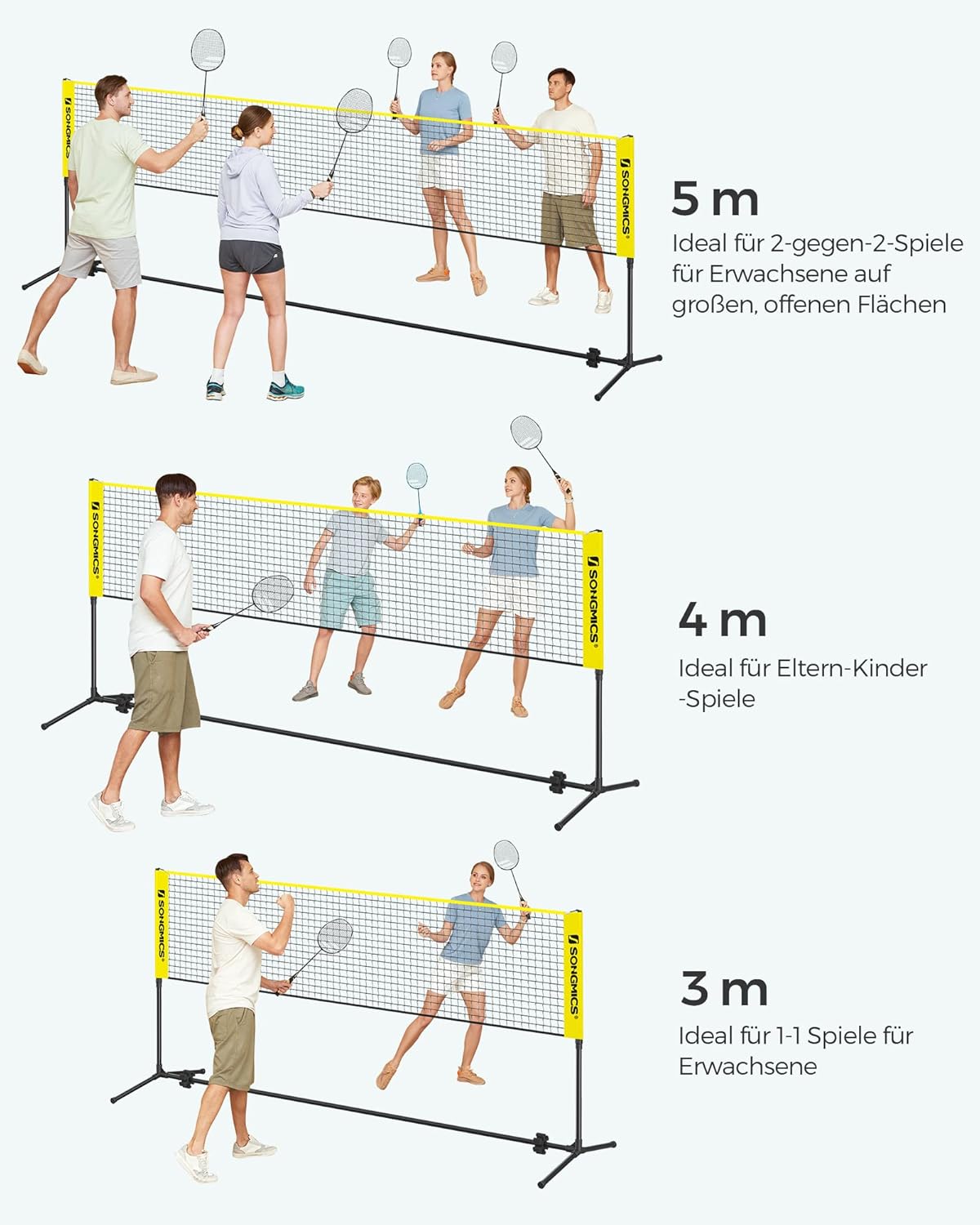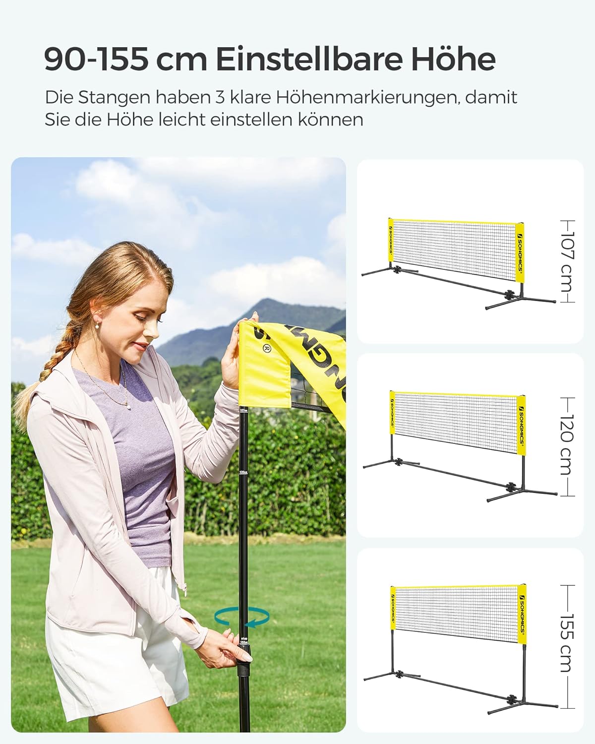 - [Passt für verschiedene Sportarten] Klare Höhenmarkierungen an den Rohren ermöglichen die Einstellung der Höhe zwischen 90 cm und 155 cm, wodurch das Netz für Badminton, Beachvolleyball und Pickleball geeignet ist