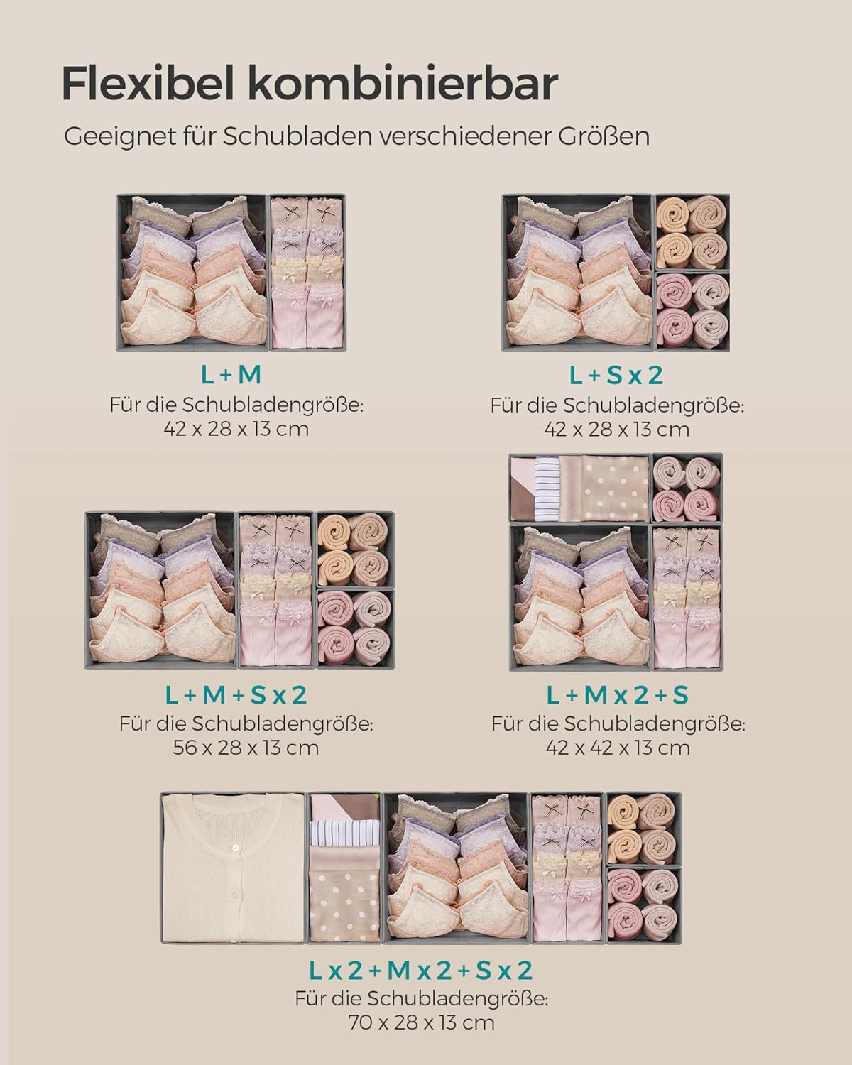 • 【ORDNUNG ERZEUGT GLÜCKSGEFÜHLE】Verstauen Sie BHs in den grossen, Slips in den mittelgrossen und Socken in den kleinen Boxen. Diese Faltboxen helfen Ihnen, Gürtel, Strumpfhosen etc. sortiert aufzubewahren