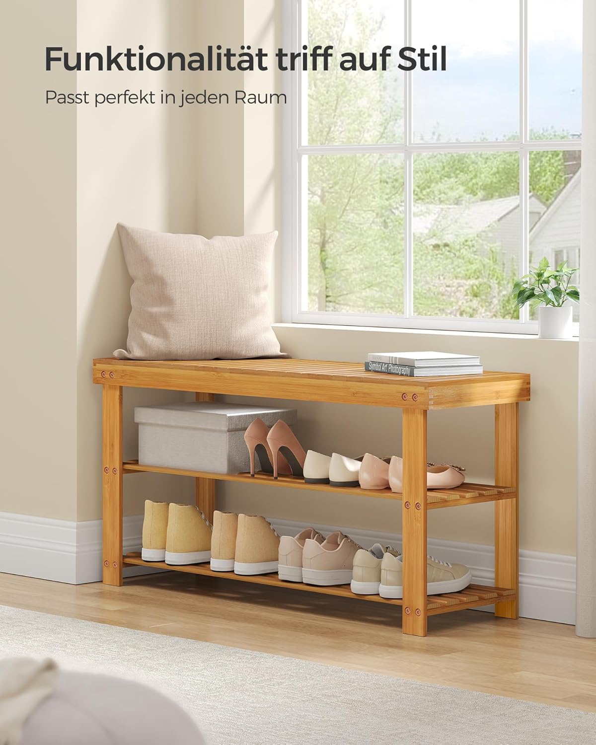 - 【WAS SIE BEKOMMEN】Eine Schuhbank aus Bambus, die es Ihnen ermöglicht, sich hinzusetzen und Ihre Schuhe zu wechseln, während Sie dank der zwei Fächer darunter Ihre Schuhe griffbereit haben