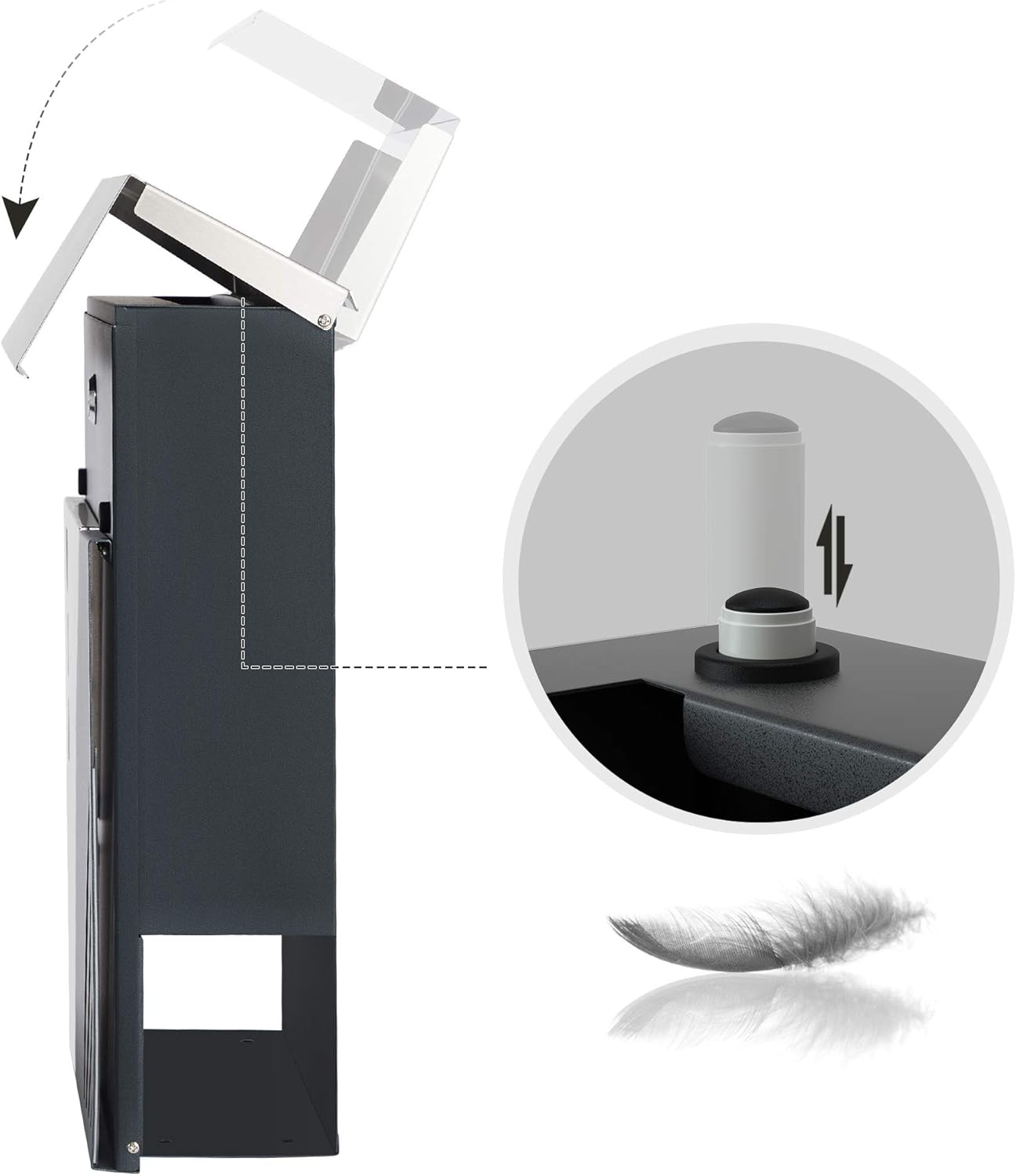 • Nachdem Ihr Postbote gegangen ist... schliesst der Klappdeckel des Briefkastens dank des Dämpfers unter dem Deckel sanft und langsam, ohne Geräusche zu verursachen. Der Postbote wird es Ihnen danken!