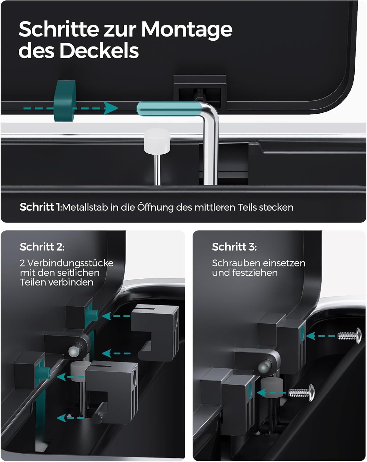 Schritte zur Montage des Deckels - Schritt 1: Metallstab in die Öffnung des mittleren Teils stecken - Schritt 2: 2 Verbindungsstücke mit den seitlichen Teilen verbinden - Schritt 3: Schrauben einsetzen und festziehen