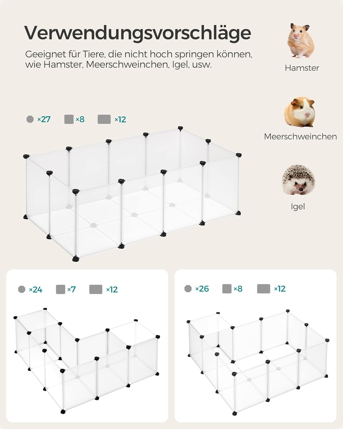 - [Transparent und leicht zu reinigen] Dank der transparenten Kunststoffplatten können Sie Ihre pelzigen kleinen Freunde stets im Auge behalten und mit ihnen spielen; wenn der Zaun schmutzig wird, wischen Sie ihn einfach mit einem feuchten Tuch ab