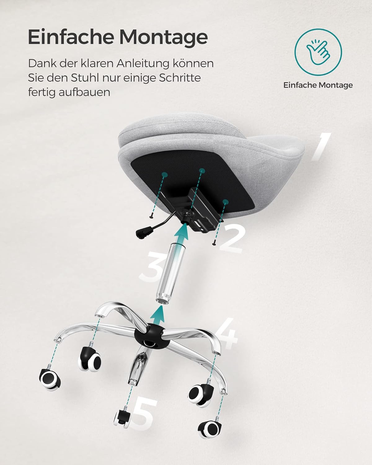 - [Einfache Montage] Befestigen Sie die Bodenplatte mit Schrauben unten an der Sitzfläche, installieren Sie die Gaszylinder und die Rollen – nur einige Schritte ist schon der C omputerstuhl fertig aufgebaut