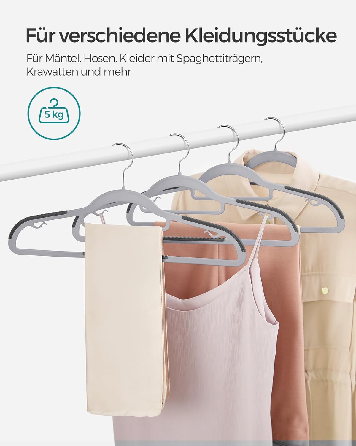 - Rutschfest: Die verbesserten Gummi-Aufsätze im Schulterbereich und an der Hosenstange der Kleiderbügel verhindern, dass Ihre Kleidungsstücke abrutschen – auch Seidenblusen haben einen sicheren und festen Halt