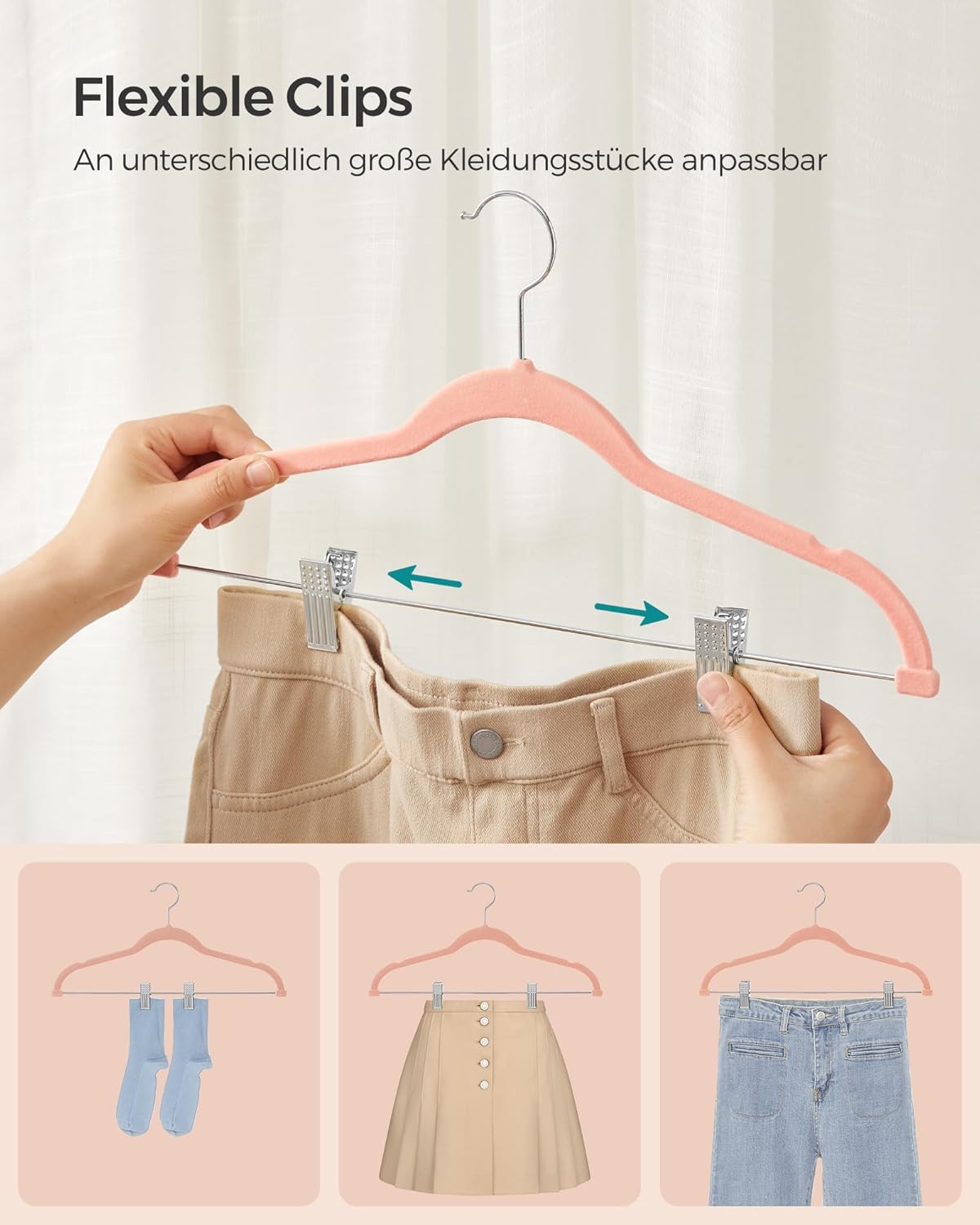 - [Flexible Clips] Der Abstand zwischen den 2 Klammern der Bügel ist verstellbar (maximaler Abstand: 38 cm) – für Hosen und Röcke verschiedener Grössen gut geeignet. Die Clips sind mit Gummi-Pads ausgestattet, die rutschfest sind und Ihre Kleidung