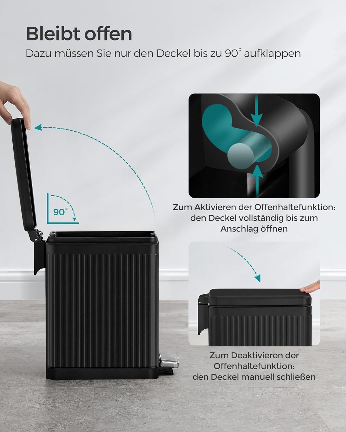 - 【ÖFFNEN MIT EINEM TRITT】Der Deckel des Abfallbehälters öffnet sich, wenn Sie auf das Pedal treten, sodass Sie den Eimer während der Entsorgung nicht berühren müssen