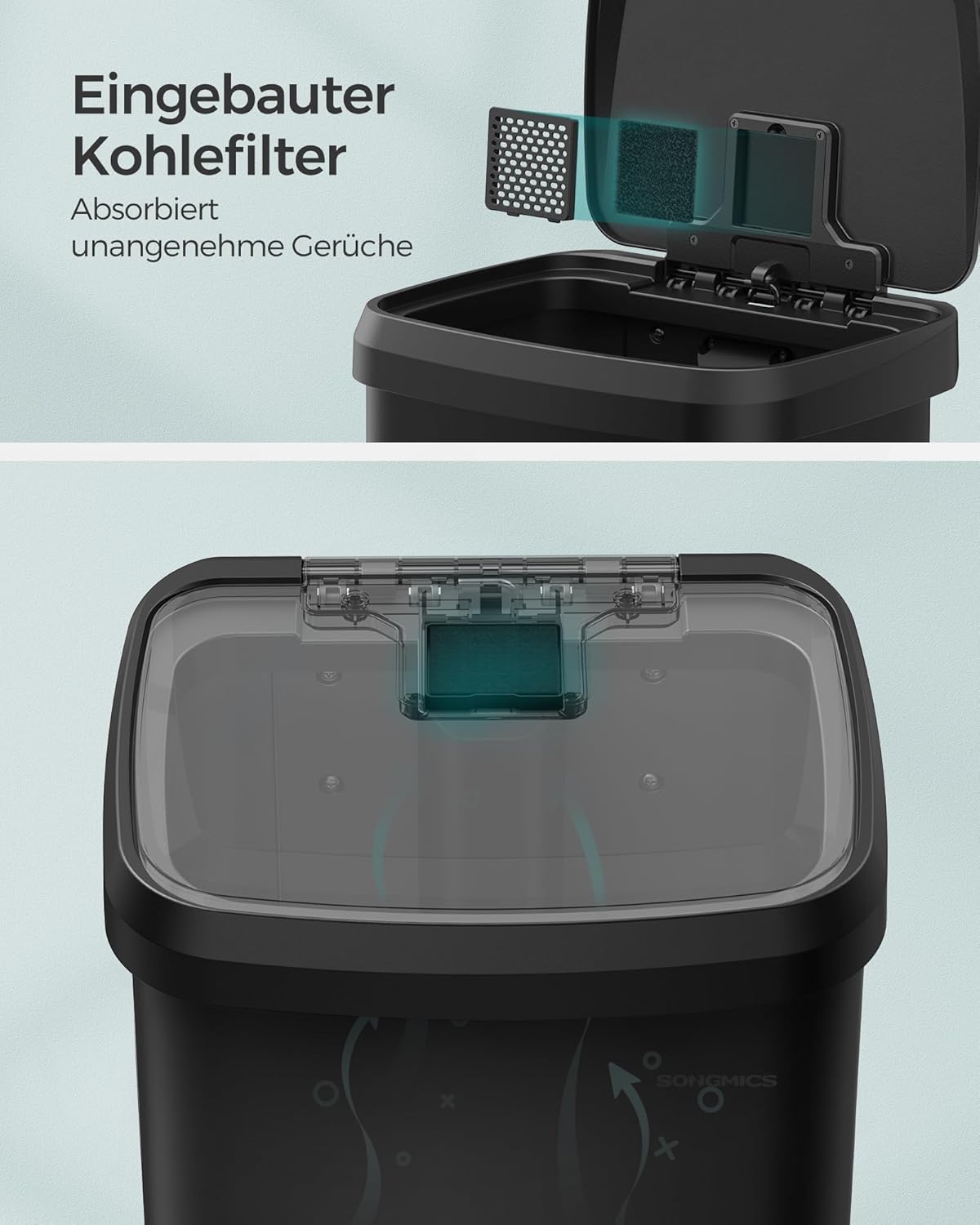 - [Durchdachte Details] Der Kohlefilter im Deckel absorbiert unangenehme Gerüche, sodass Ihre Küche stets frisch riecht. Im Lieferumfang sind 15 Müllsäcke (45-55 Liter) enthalten, die perfekt zu diesem Küchenmülleimer passen