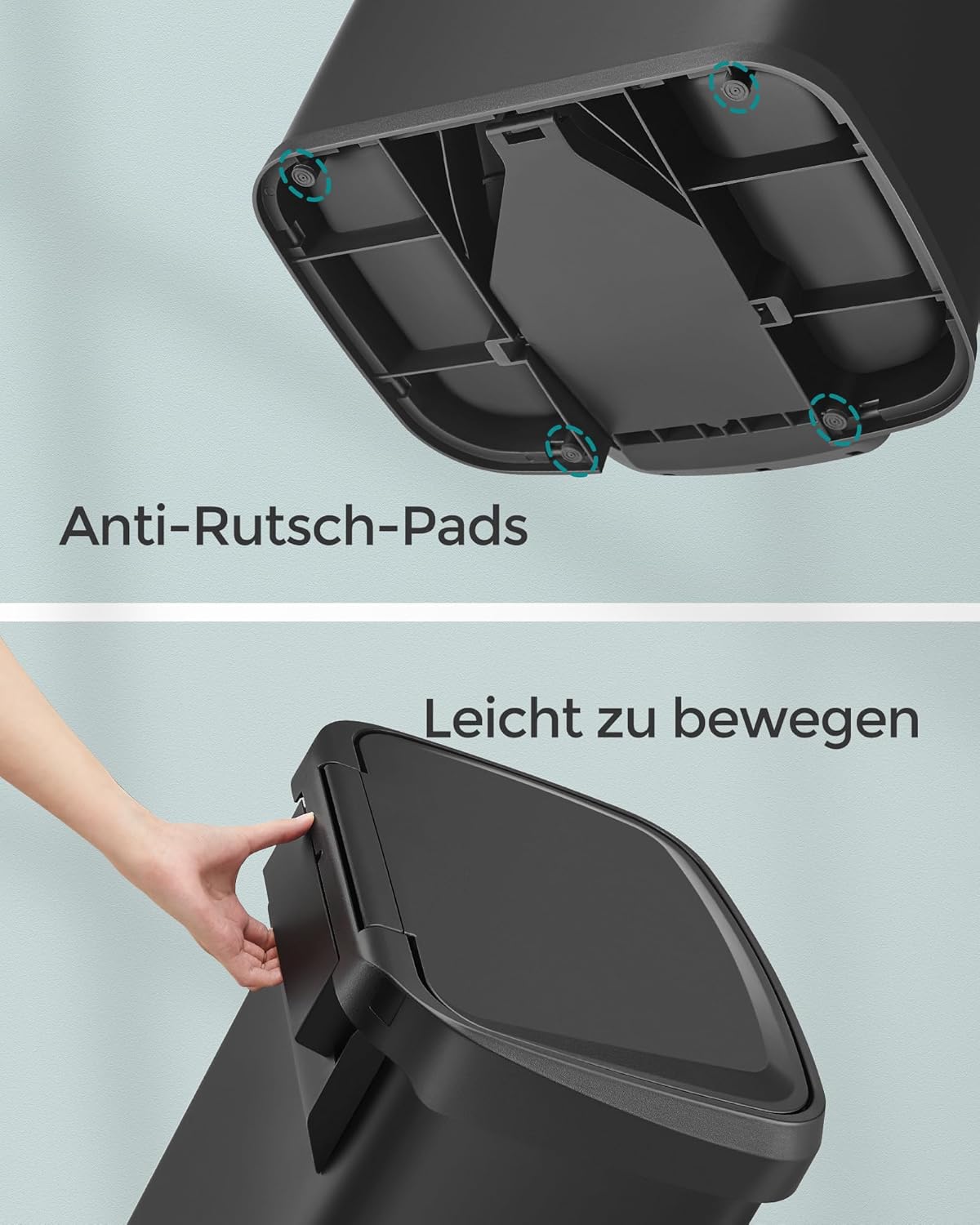 - [Schliesst sanft & bleibt offen] Der Eimer verfügt über einen Deckel, der nicht abrupt zuklappt, sondern leise und sanft schliesst. Der Deckel kann bei Küchentätigkeiten offen gehalten werden, indem man ihn vollständig mit der Hand öffnet