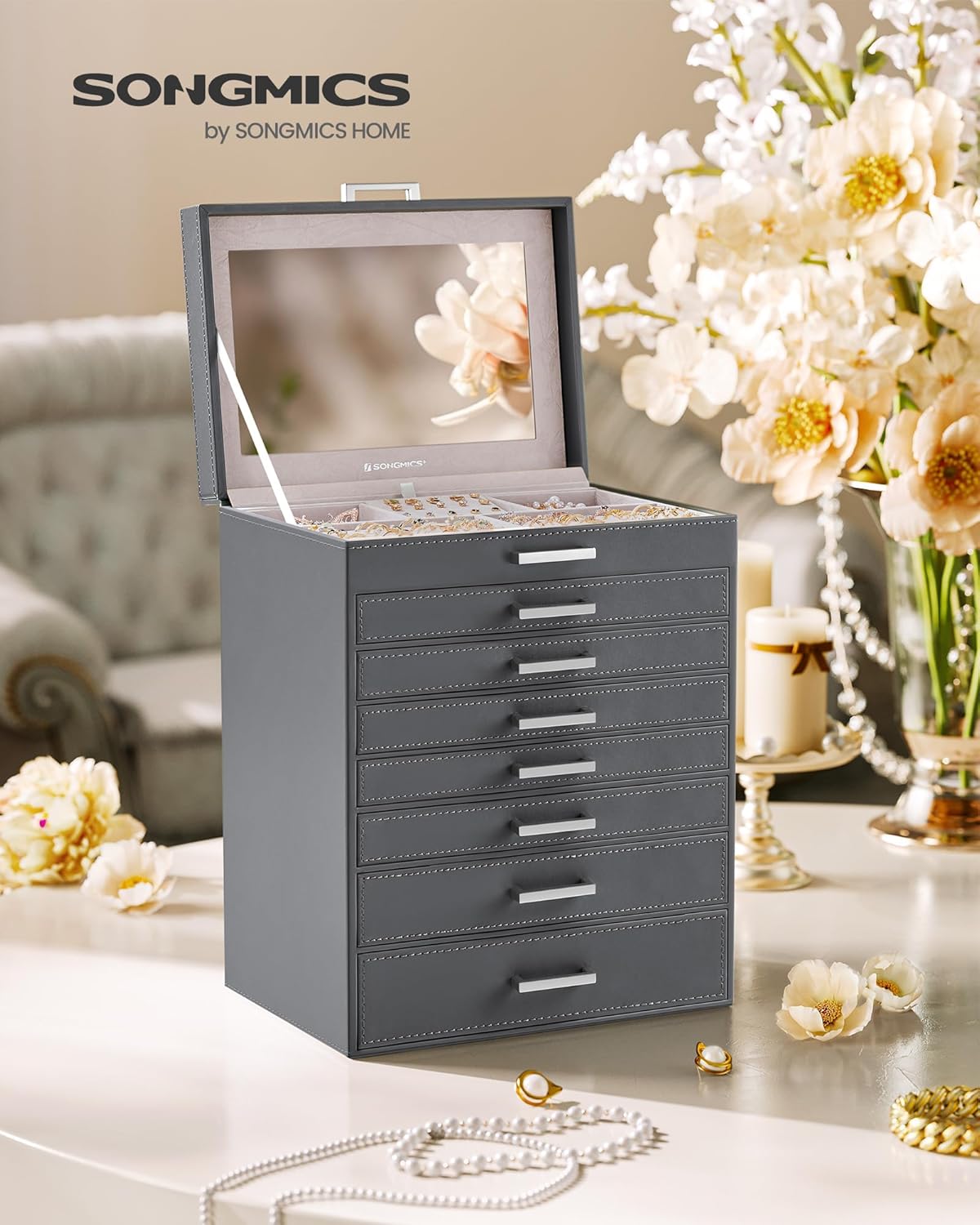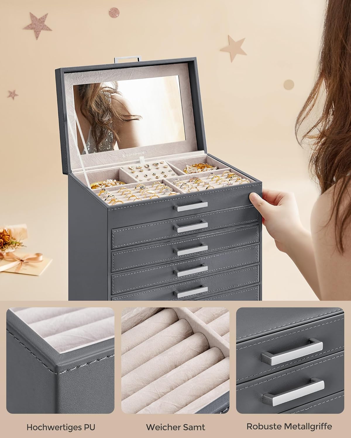SONGMICS Schmuckkästchen 8 Ebenen, Schmuckkasten mit grossem Spiegel, Schmuckschatulle, 7 Schubladen