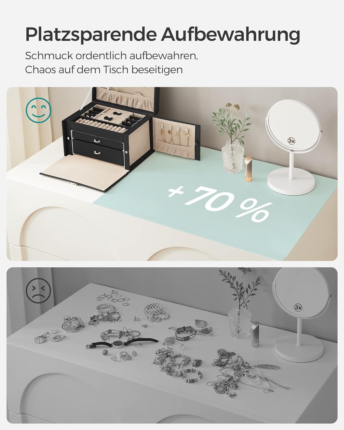 - WAS SIE BEKOMMEN: Einen stilvollen Schmuckkasten, mehrere Aufbewahrungsmöglichkeiten für all Ihre Accessoires und eine Mini-Box, die Sie auf Reisen einfach mitnehmen können