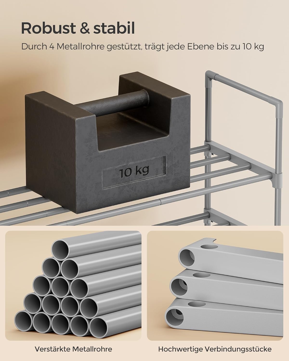 • Robust und langlebig: Die verstärkten Metallrohre, die mit hochwertigen Kunststoffverbindern verbunden werden, verleihen dem Schuhständer hohe Stabilität. Jede Ebene trägt bis zu 10 kg
