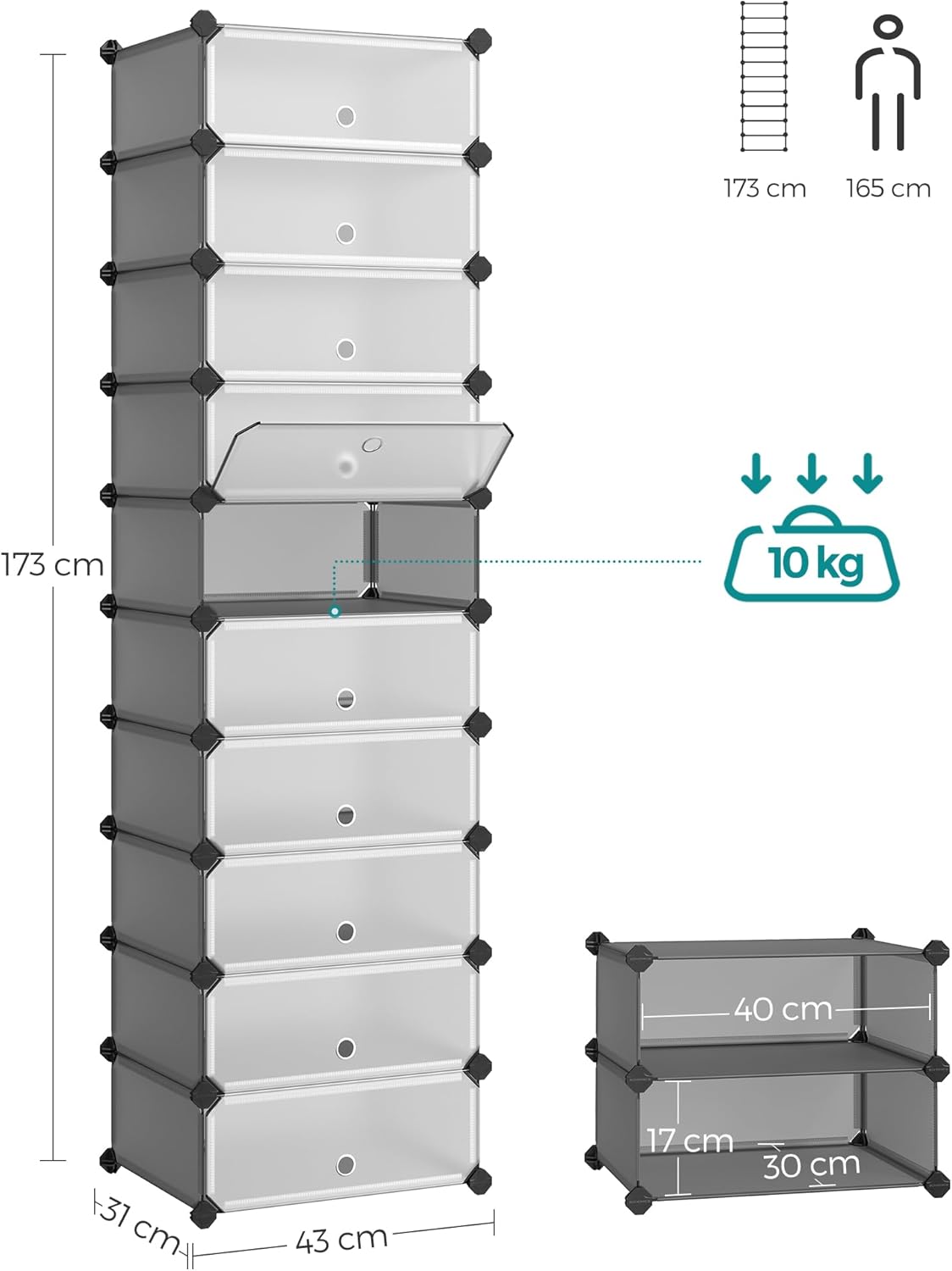 - 【VIEL PLATZ FÜR ALL IHRE SCHUHE】Das 10-teilige Schuhregal mit einer Grösse von 31 x 43 x 173 cm bietet Platz für ca. 20 Paar Schuhe; jedes Fach (40 x 30 x 17 cm) ist gross genug für Turnschuhe, flache Schuhe, Absätze und Schuhkartons
