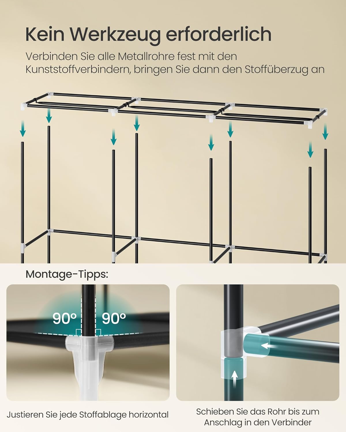 - [Kinderleichte Montage] Sie brauchen kein Montagewerkzeug vorzubereiten, Sie müssen lediglich die Metallrohre mit den Kunststoffverbindern verbinden und sie mit einer Stoffabdeckung abdecken, um diesen Schrank in wenigen Minuten zu installieren