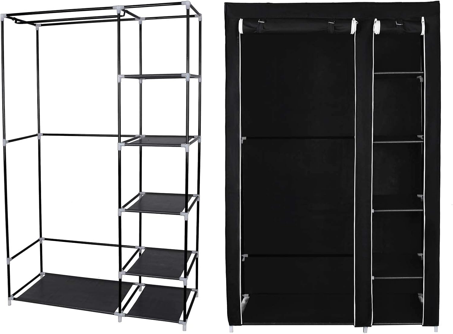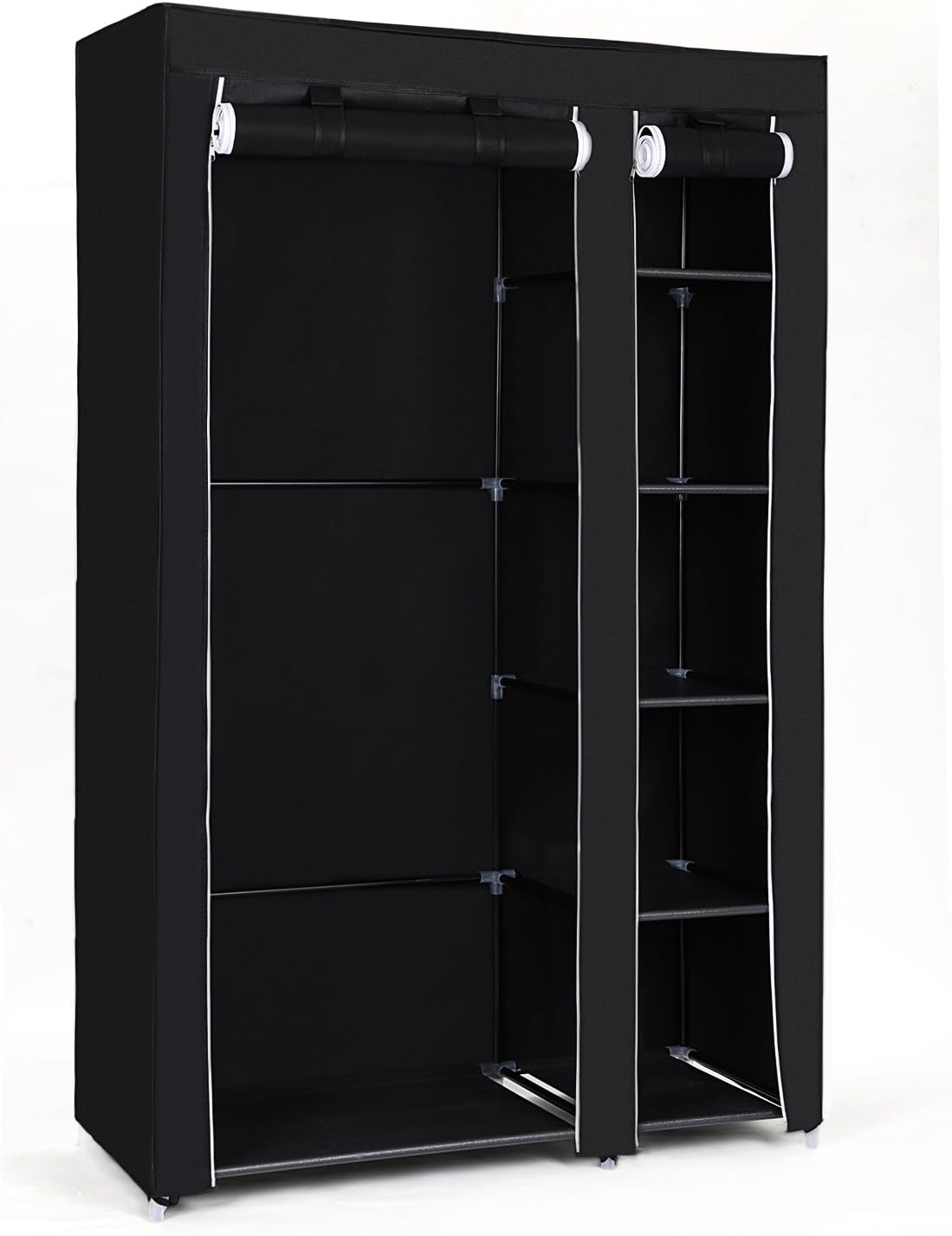 - WAS KANN ER FÜR SIE TUN? Schauen Sie sich diesen Schrank an: Kleiderstange und offenes Fach auf der einen Seite, 5 Regalebenen auf der anderen Seite, drumherum ein schwarzer Überzug, der längere Mäntel sowie gefaltete Kleidung vor Licht und Staub