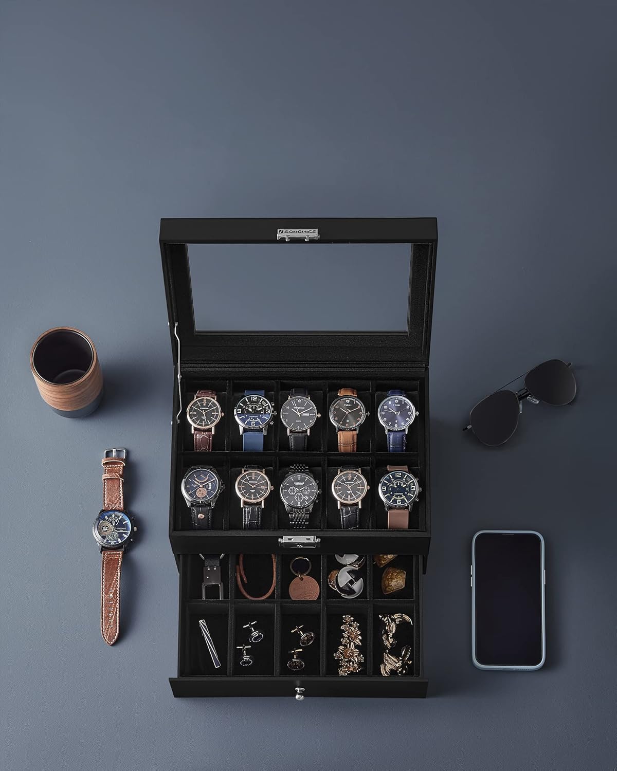 - [Transparenter Glasdeckel] Unter dem durchsichtigen Glasdeckel sind Ihre Lieblingsuhren oder Ihr Schmuck auf einen Blick erkennbar. Sie ist nicht nur strapazierfähig und leicht zu reinigen, sondern schützt auch Ihre Schätze vor Staub