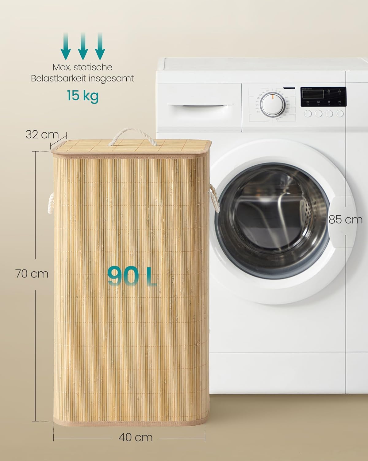 - Stilvoll & geräumig: Der Wäschekorb aus Bambus verleiht Ihrem Bad, der Waschküche oder dem Schlafzimmer eine natürliche Note. Mit einer grossen Kapazität von 90 L bietet er genug Platz für eine Woche Wäsche einer Person