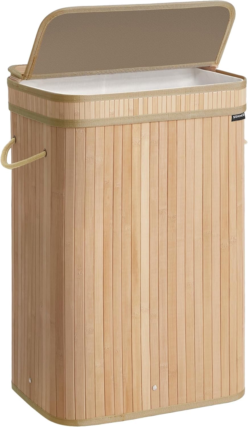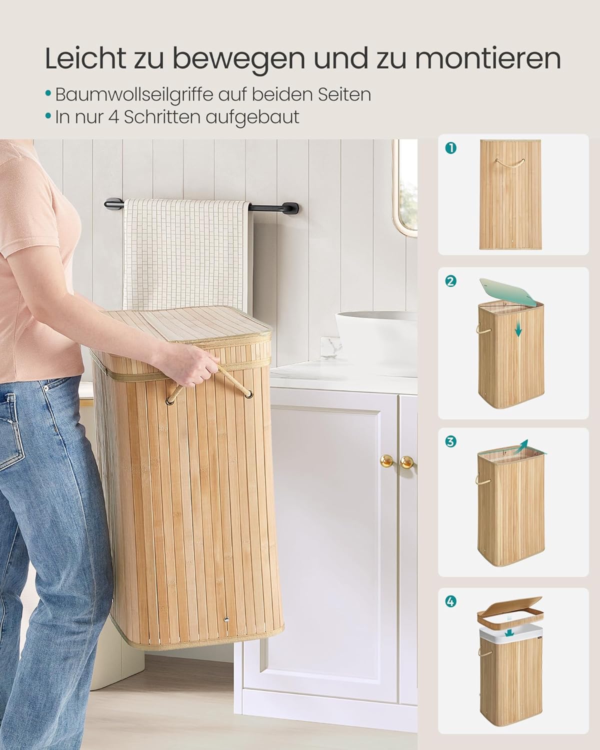 - [Stabil & klappbar] Diese aus 17 mm breiten Bambuslamellen gefertigte und von einem Metallrahmen gestützte Wäschebox ist stabil, robust und trägt bis zu 20 kg; dank der einfachen Konstruktion lässt sie sich bei Nichtgebrauch leicht zusammenklappen