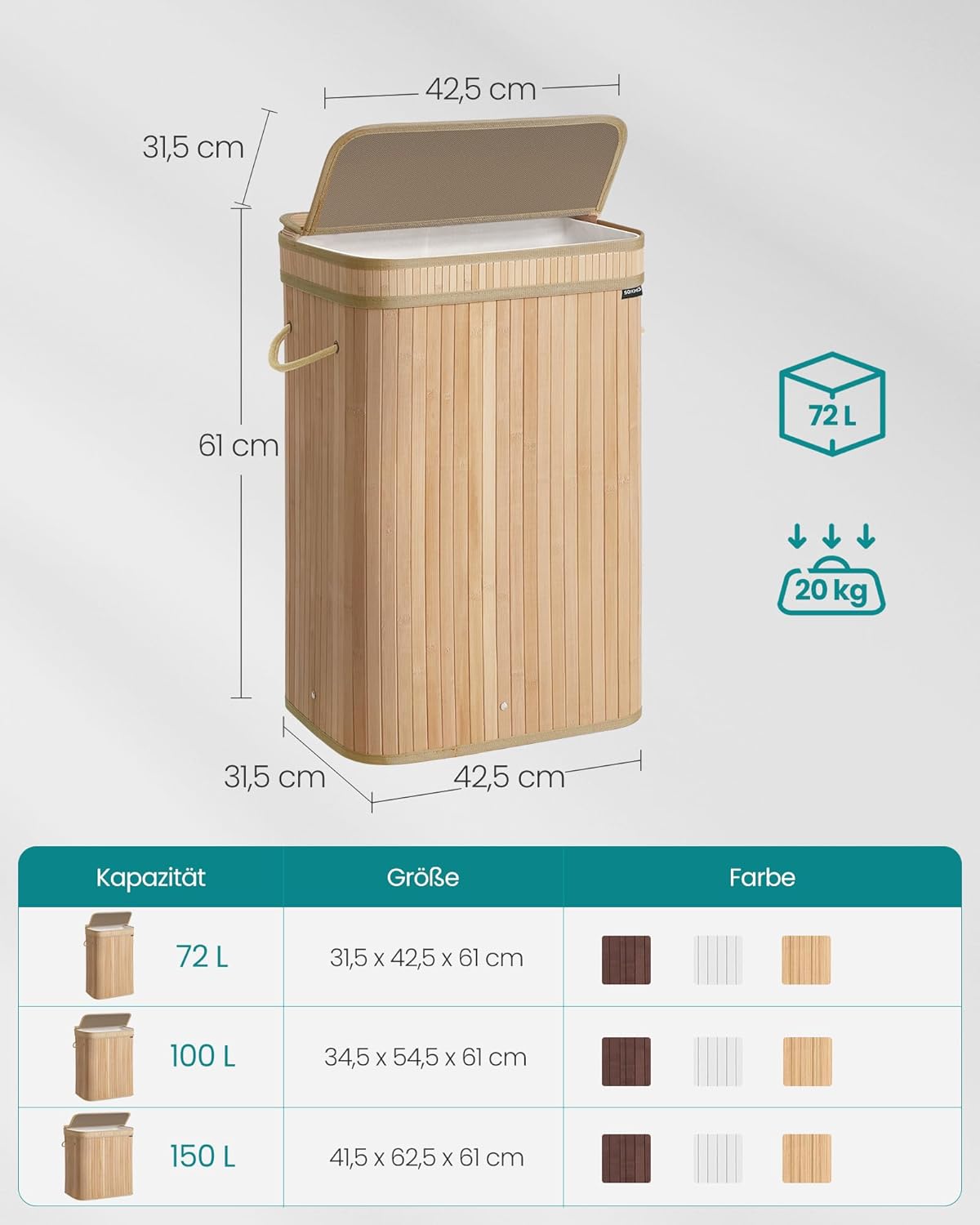 - [72 Liter – grosse Kapazität] Der 31,5 x 42,5 x 61 cm grosse Wäschesammler bietet viel Stauraum (72 Liter), in dem schmutzige Kleidung einer Familie für eine Woche Platz findet