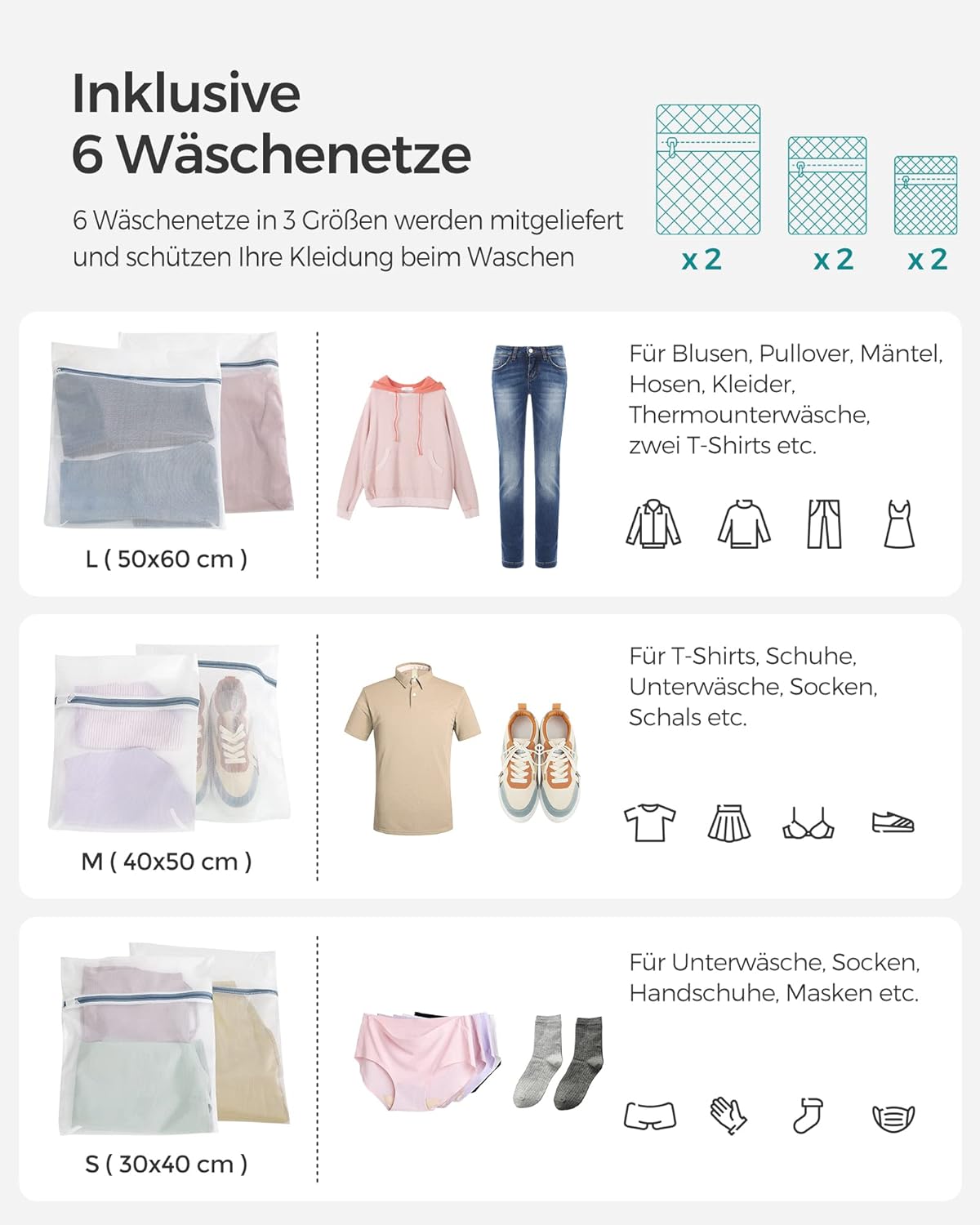 - [Inklusive Wäschenetze] Dank der 6 mitgelieferten Wäschenetze können Sie Ihre Unterwäsche oder andere empfindlichen Kleidungsstücke beim Waschen in der Waschmaschine schützen