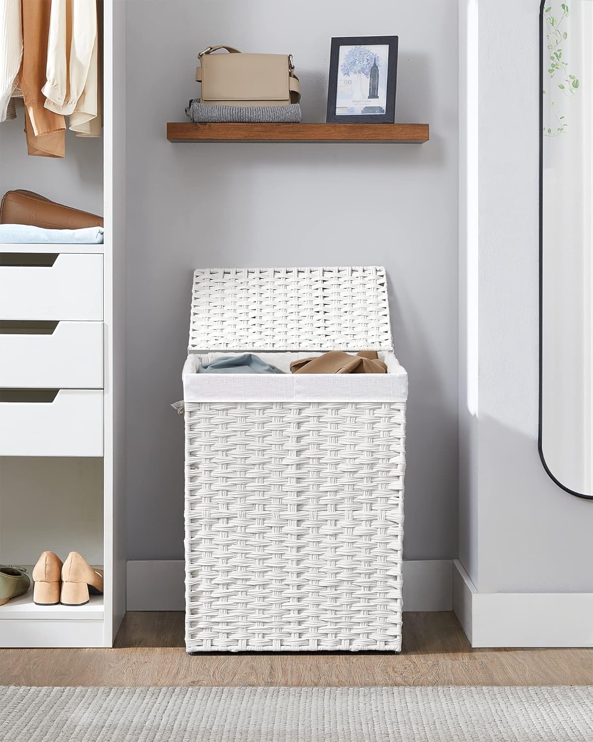 - [Mit Deckel & mit 2 Fächern] Der Deckel des Wäschekorbs lässt sich mit einer Hand öffnen. Er verhindert ausserdem, dass von Schmutzwäsche ausgehende Gerüche austreten und schützt vor Staub; in den 2 Fächern können Sie Ihre Wäsche nach Farben
