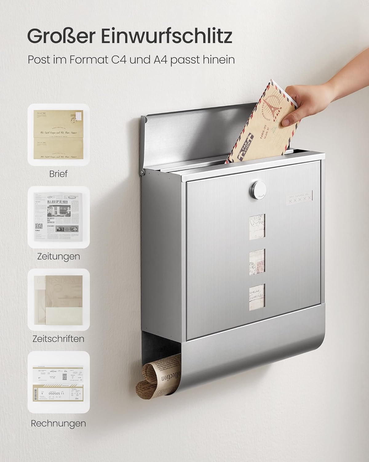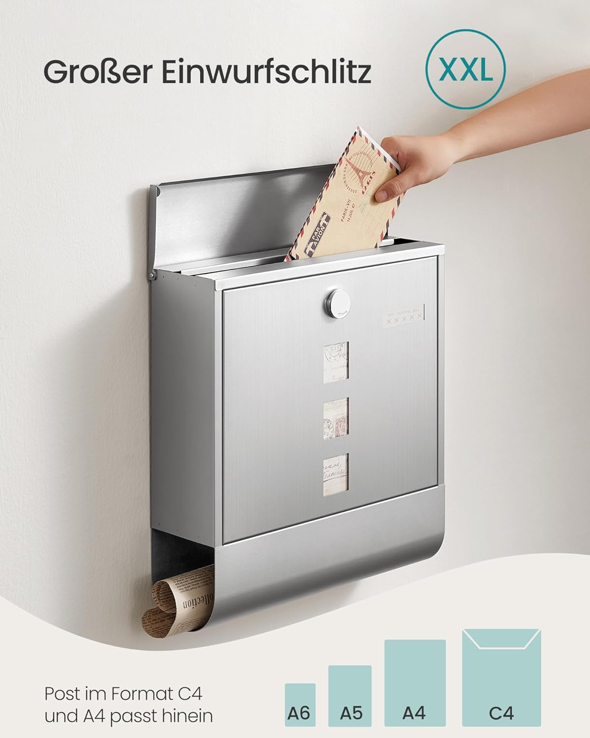SONGMICS XXL Briefkasten, Edelstahl mit Zeitungsfach, Schloss mit Kupfer-Schliesszylinder und drehba