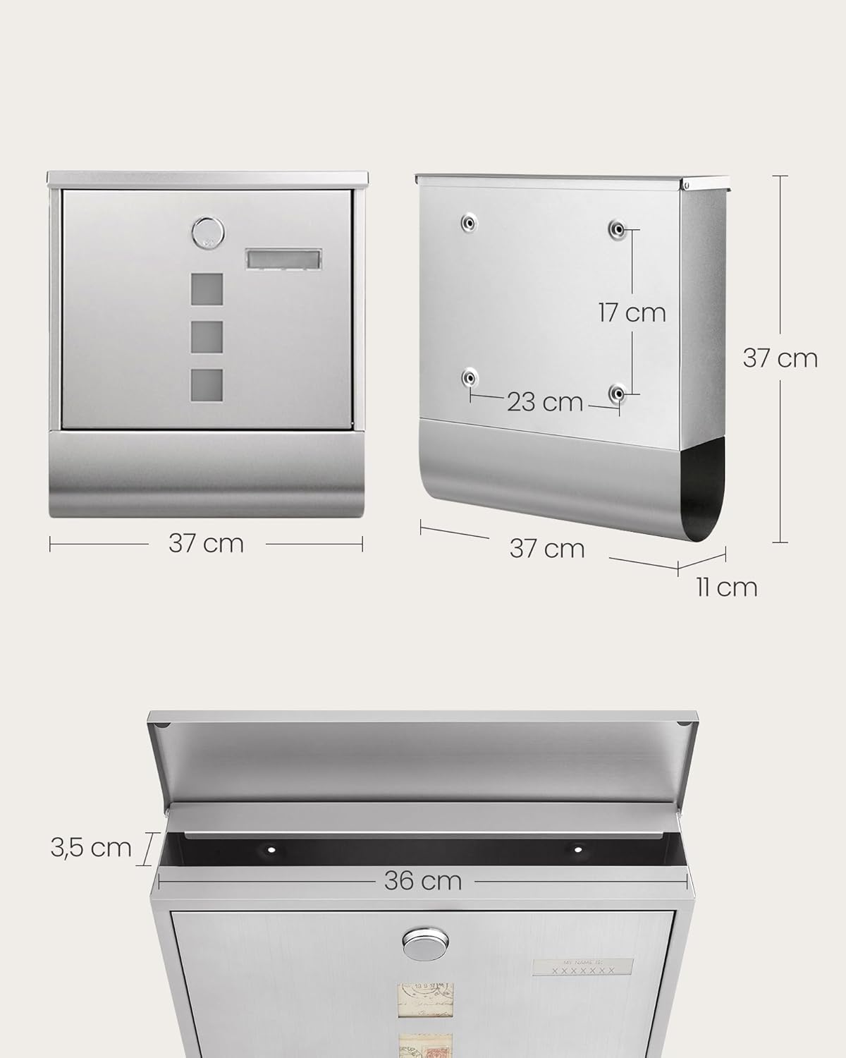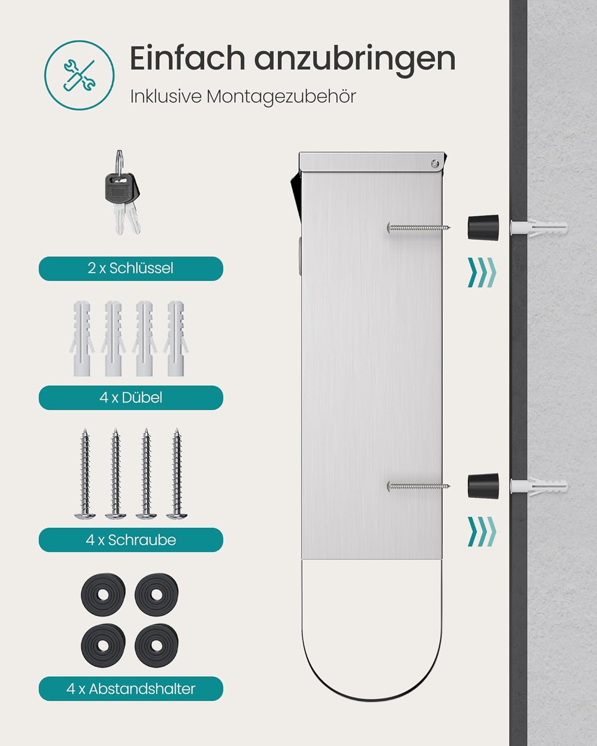 • [Was Sie bekommen] Einen stilvollen Briefkasten, der Sie über viele Jahre hinweg begleiten wird. Er besteht aus Edelstahl mit Pulverbeschichtung und ist sowohl robust als auch rostbeständig und sorgt dank der silbernen Farbe für eine moderne Note