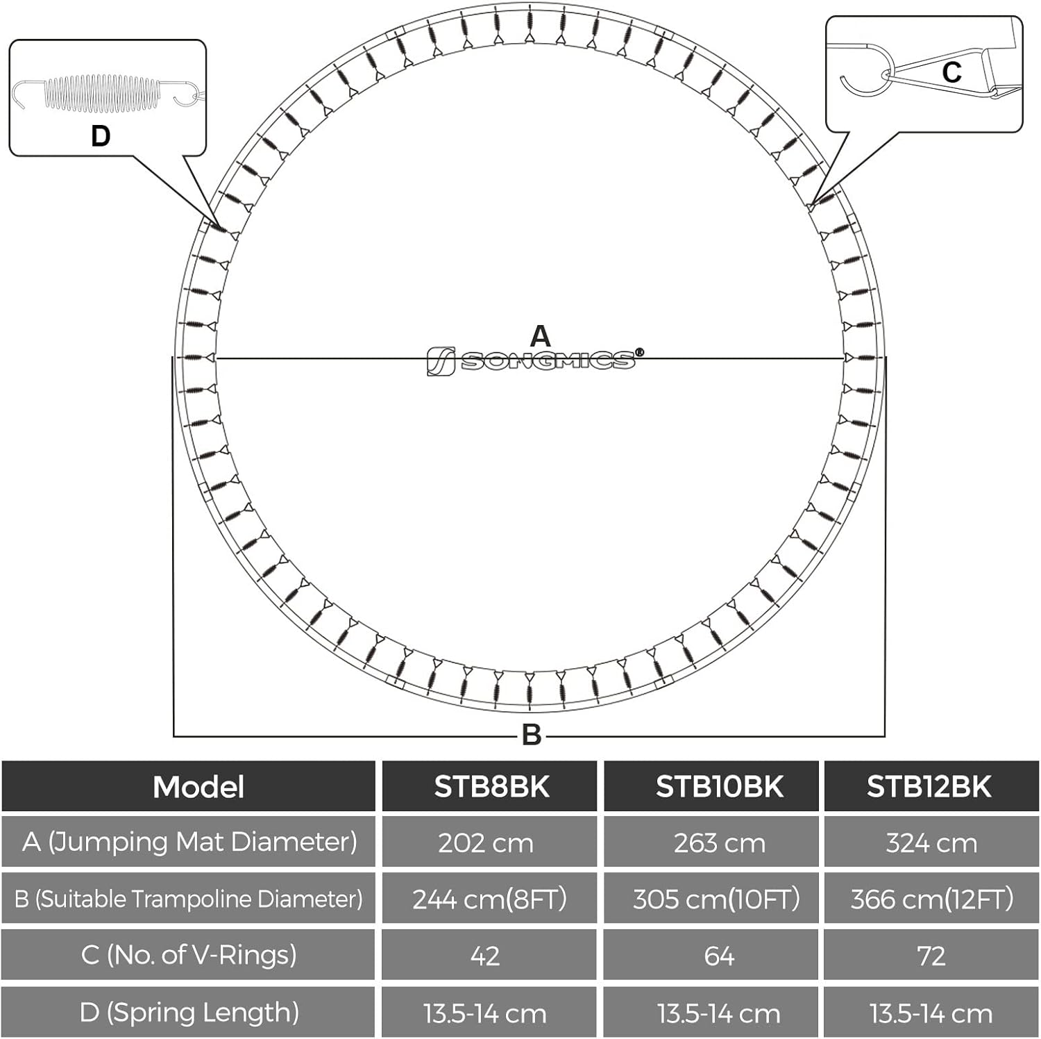 • [Geeignete Trampoline] Diese Sprungmatte mit einem Durchmesser von 263 cm hat 64 V-Ringe. Es ist geeignet für Trampoline mit einem Aussendurchmesser von 305 cm mit Federn von 13,5 bis 14 cm Länge