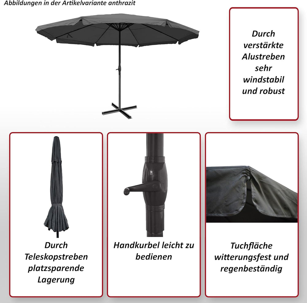 - Öffnungsmechanismus: Kurbel | Im Vergleich zum Schirm Meran hochwertigere Höhenverstellung mit Zahnrad und besserer Kurbel anstatt Seilzug | Mast um 0,7cm verstärkt | Durch verstärkte Alustreben sehr windstabil und robust | Tuchfläche witterungsfest