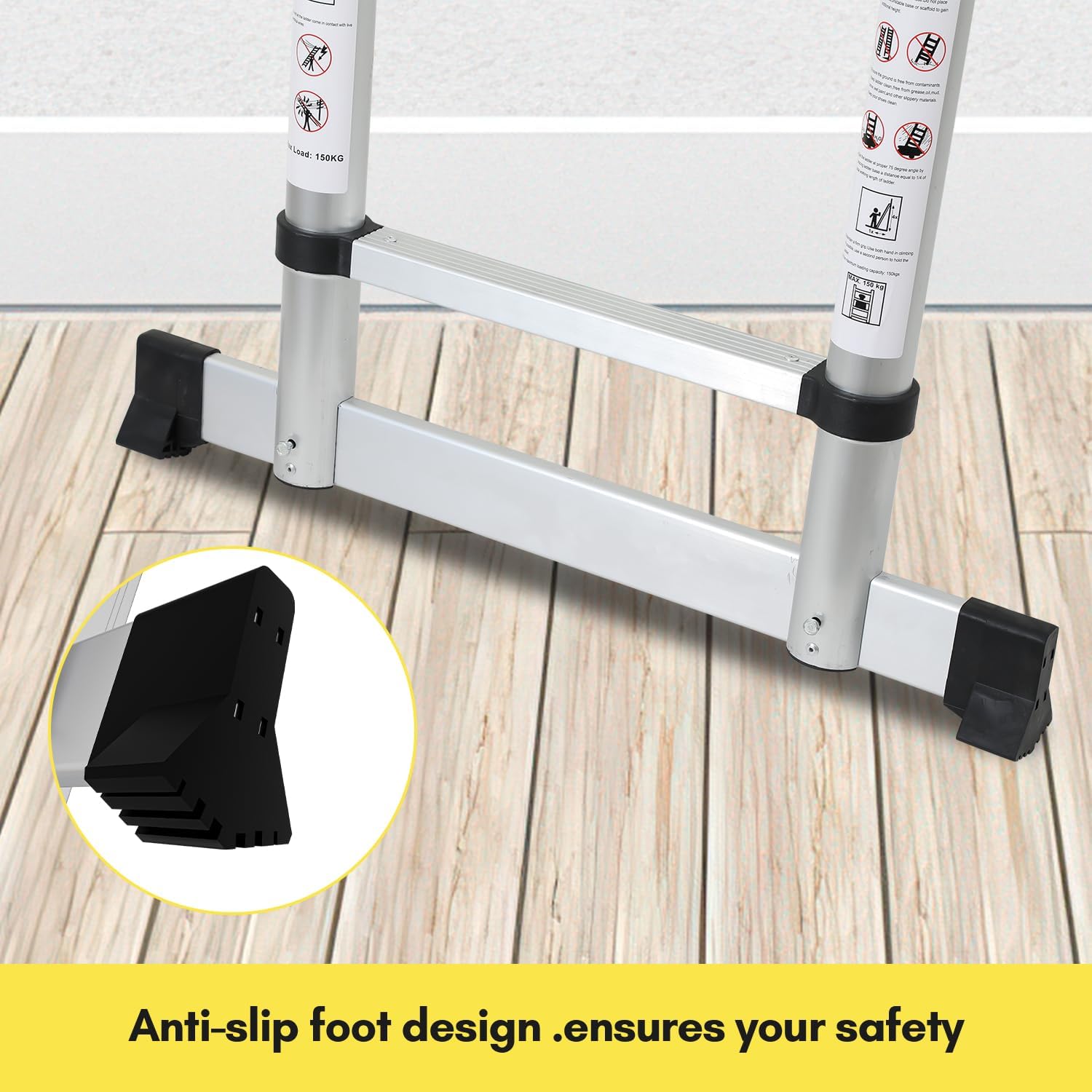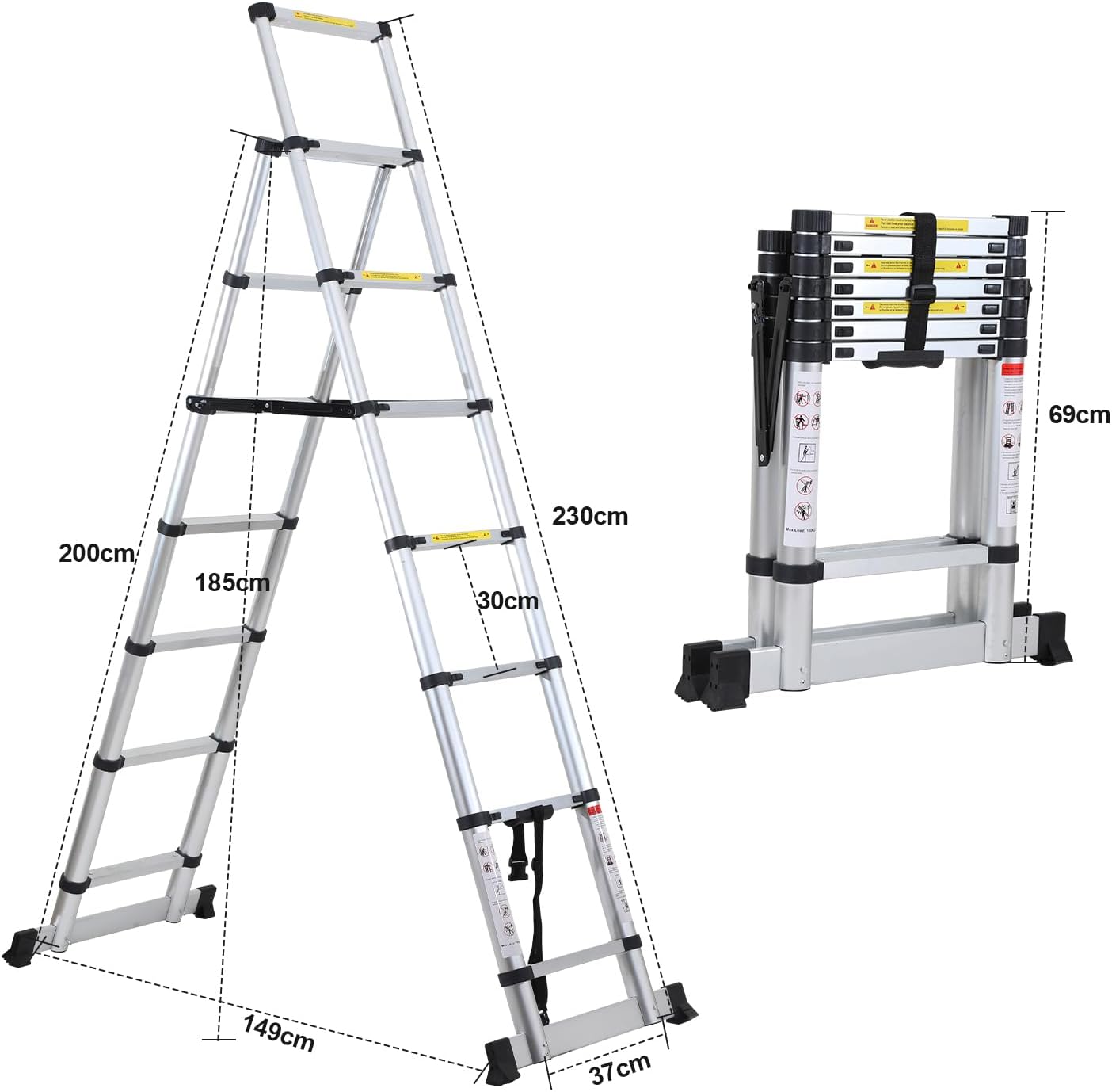 - 【Teleskopische Ausführung】Leiter hat eine einziehbare Ausführung mit einer Höhe von 2m+2,3m mit 6+7 Stufen und Bei jeder Stufe rastet der Sicherheitsstift automatisch ein, so dass die Höhe der Leiter je nach Bedarf angepasst werden kann. Die