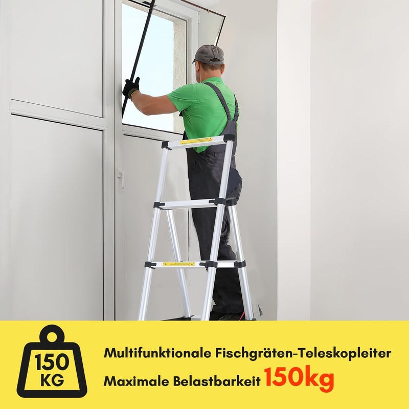 - 【Hochwertiges Material】A-Rahmen Teleskopleitern besteht aus einer hochwertigen und langlebigen Aluminiumlegierung, ist stark und sicher, rostfrei und langlebig, kann eine gute Unterstützung bieten und kann bis zu 150 kg für eine breite Palette von