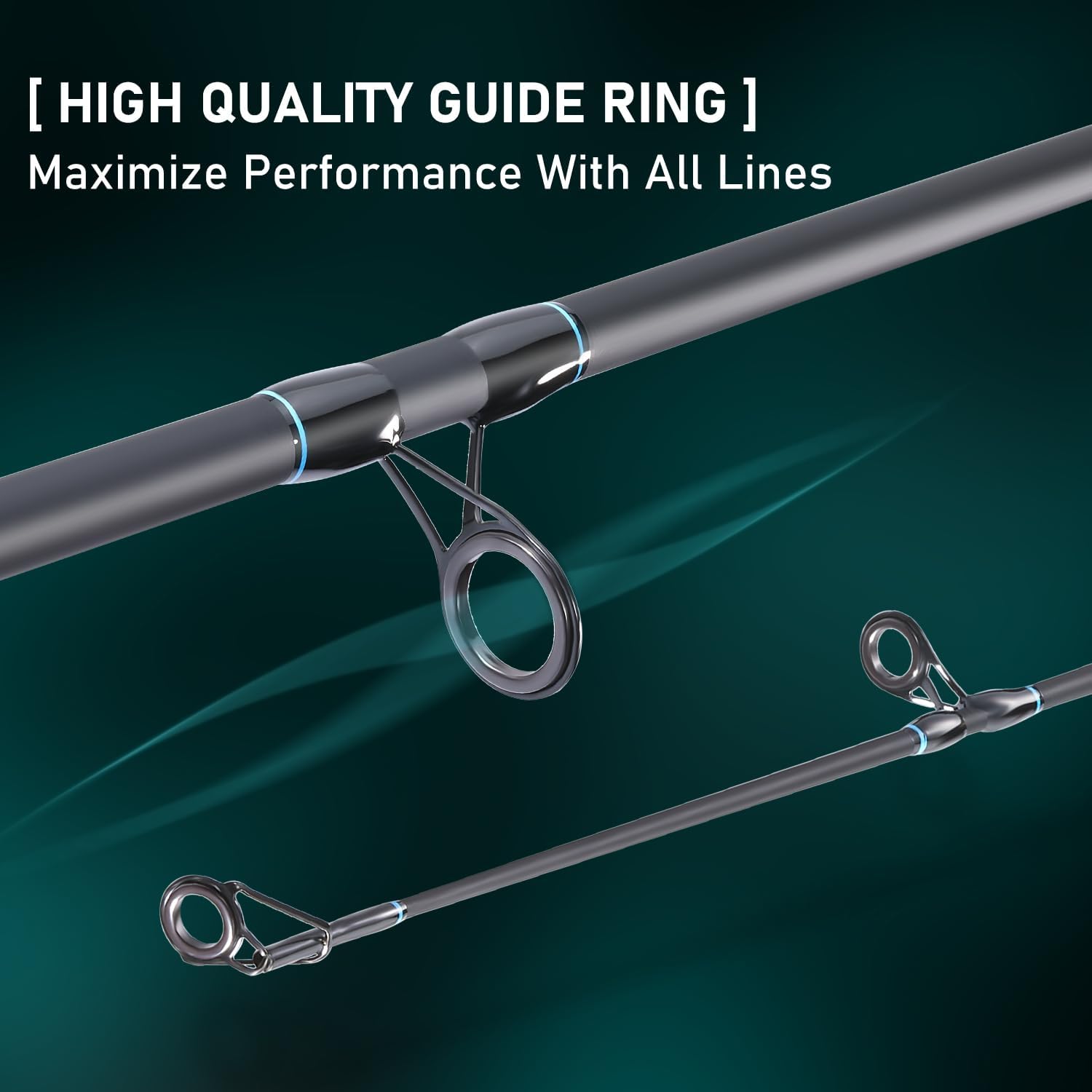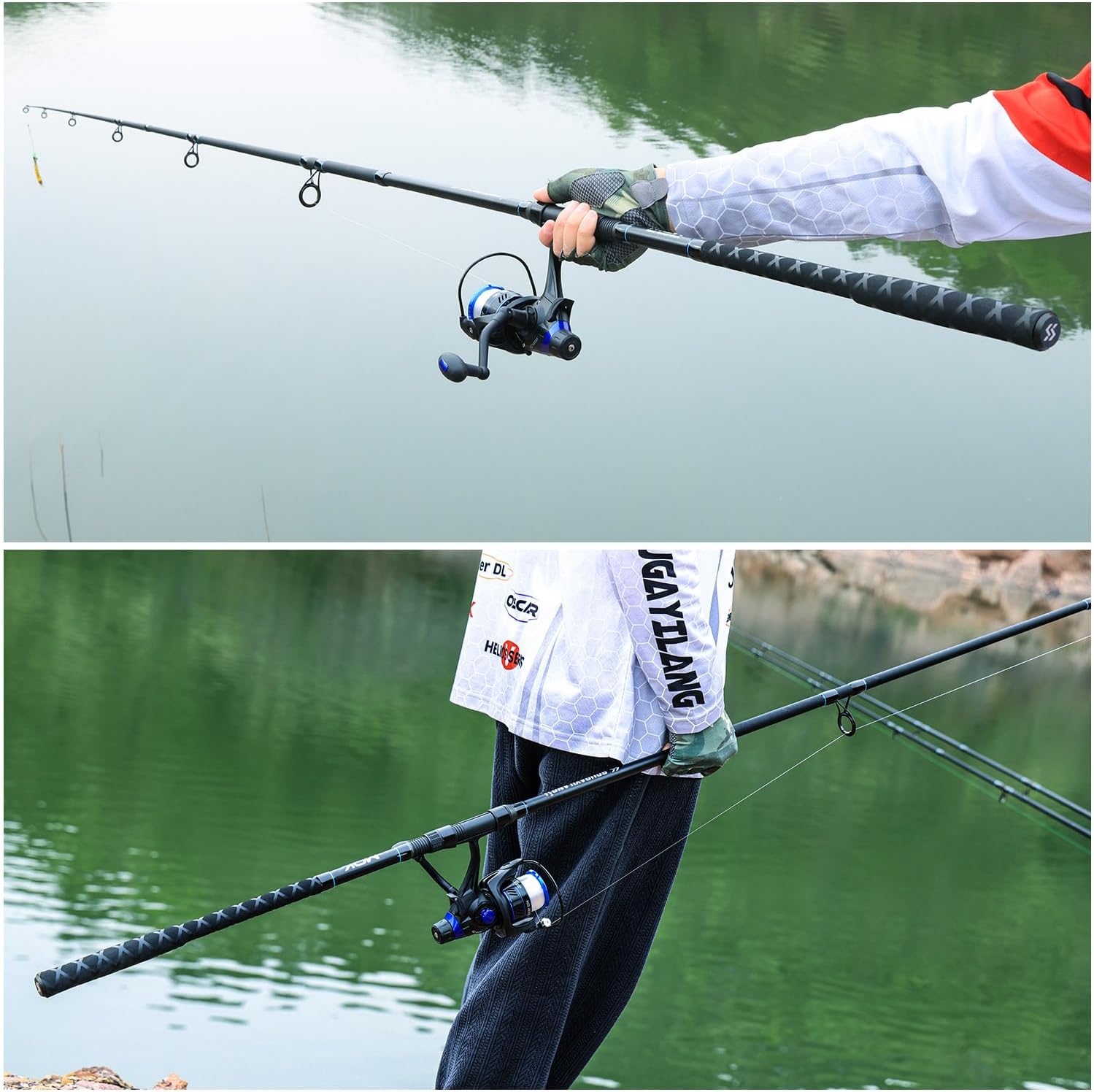 - HOCHFESTES, LEICHTES MATERIAL: Sorgfältig mit hohen Kohlenstoff-Verbundwerkstoff gefertigt, ist die Rute leicht, aber hat eine ausgezeichnete Festigkeit. Es ermöglicht Ihnen, für eine lange Zeit ohne Ermüdung der Arme zu fischen, und es kann leicht